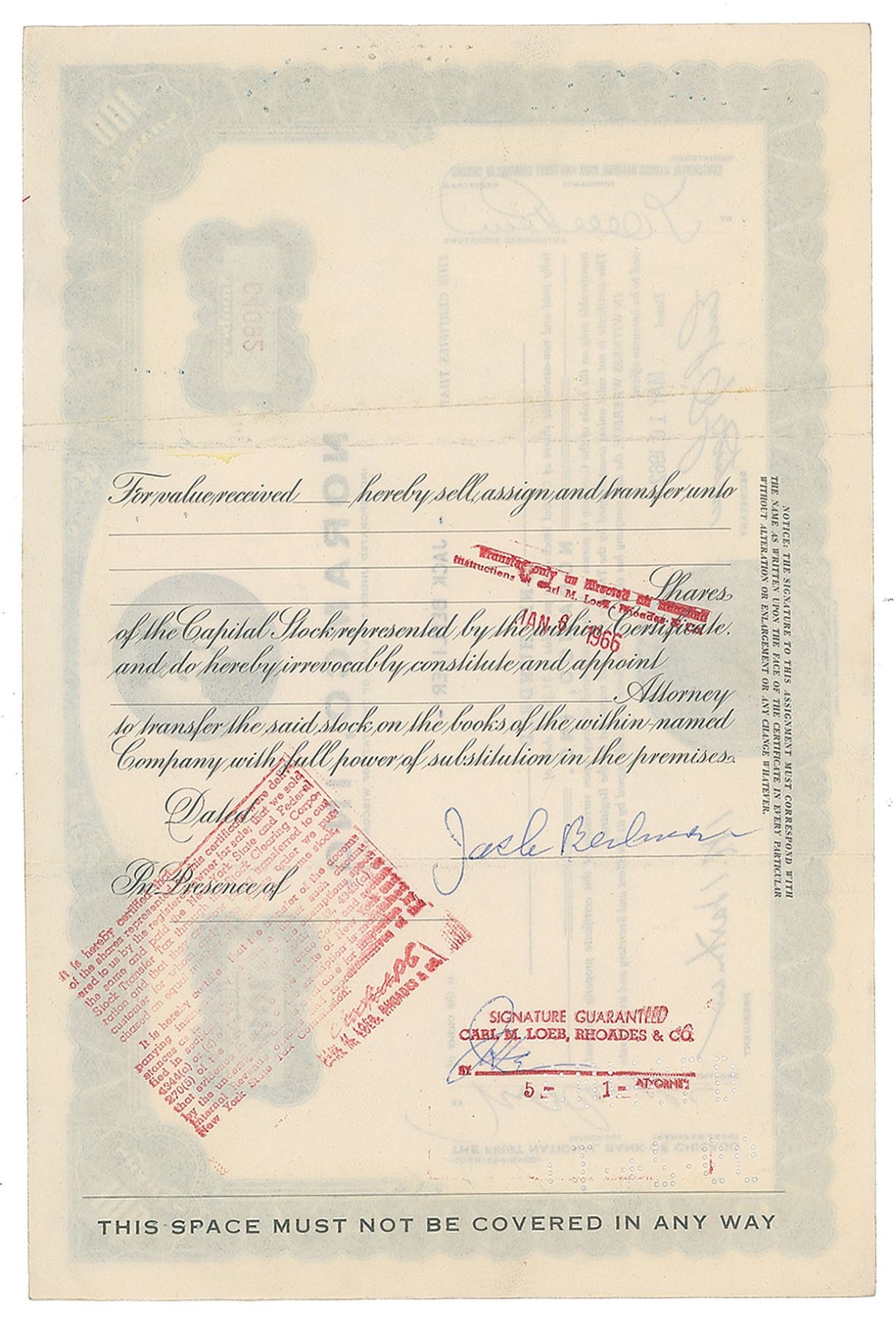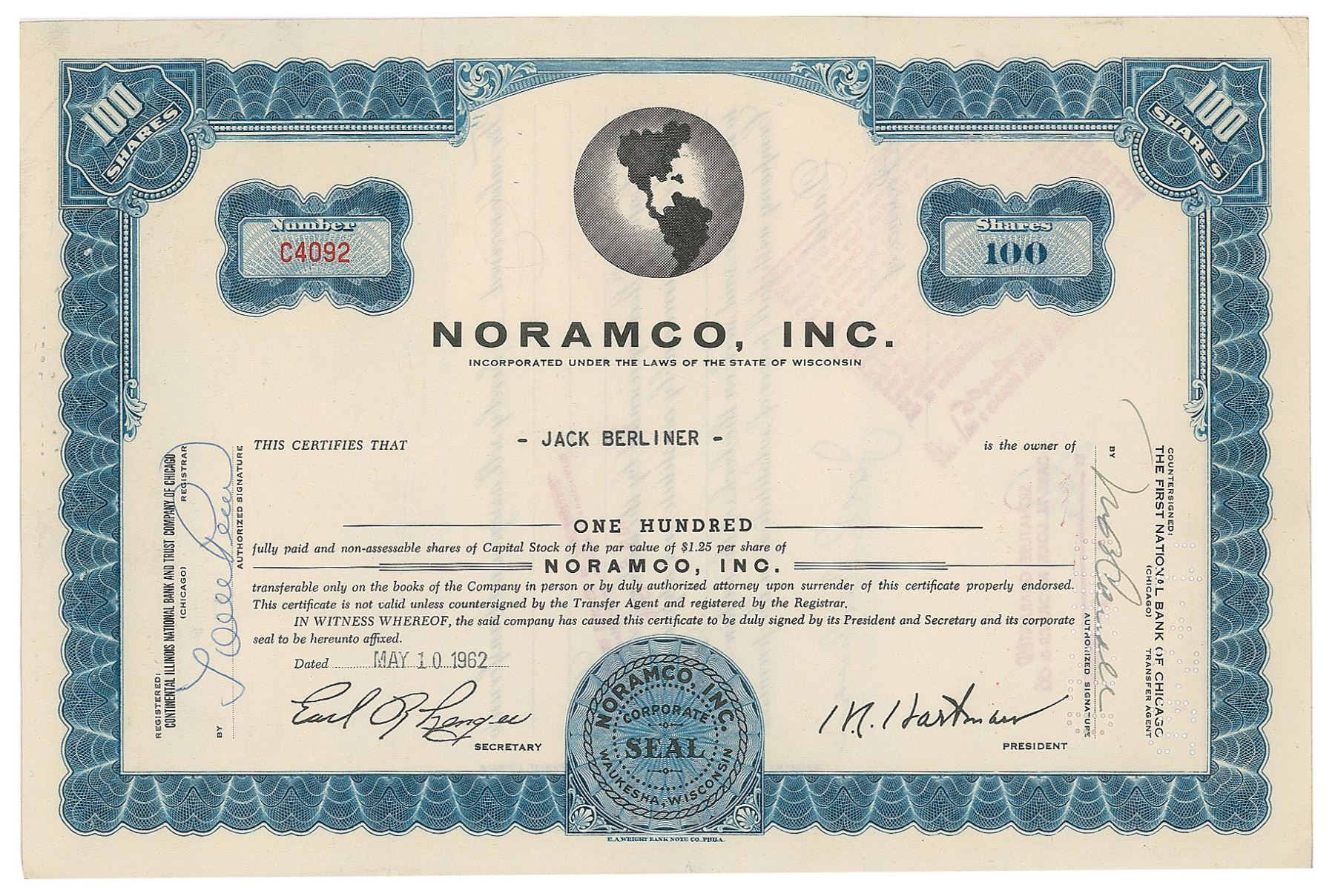 Scarce DS, signed “Jack Berliner,” one page, 11.75 x 7.75, May 10, 1962. Handsomely engraved stock certificate for 100 shares in Noramco, Inc., issued to Jack Berliner. Signed on the reverse in blue ballpoint by Berliner. In fine condition.