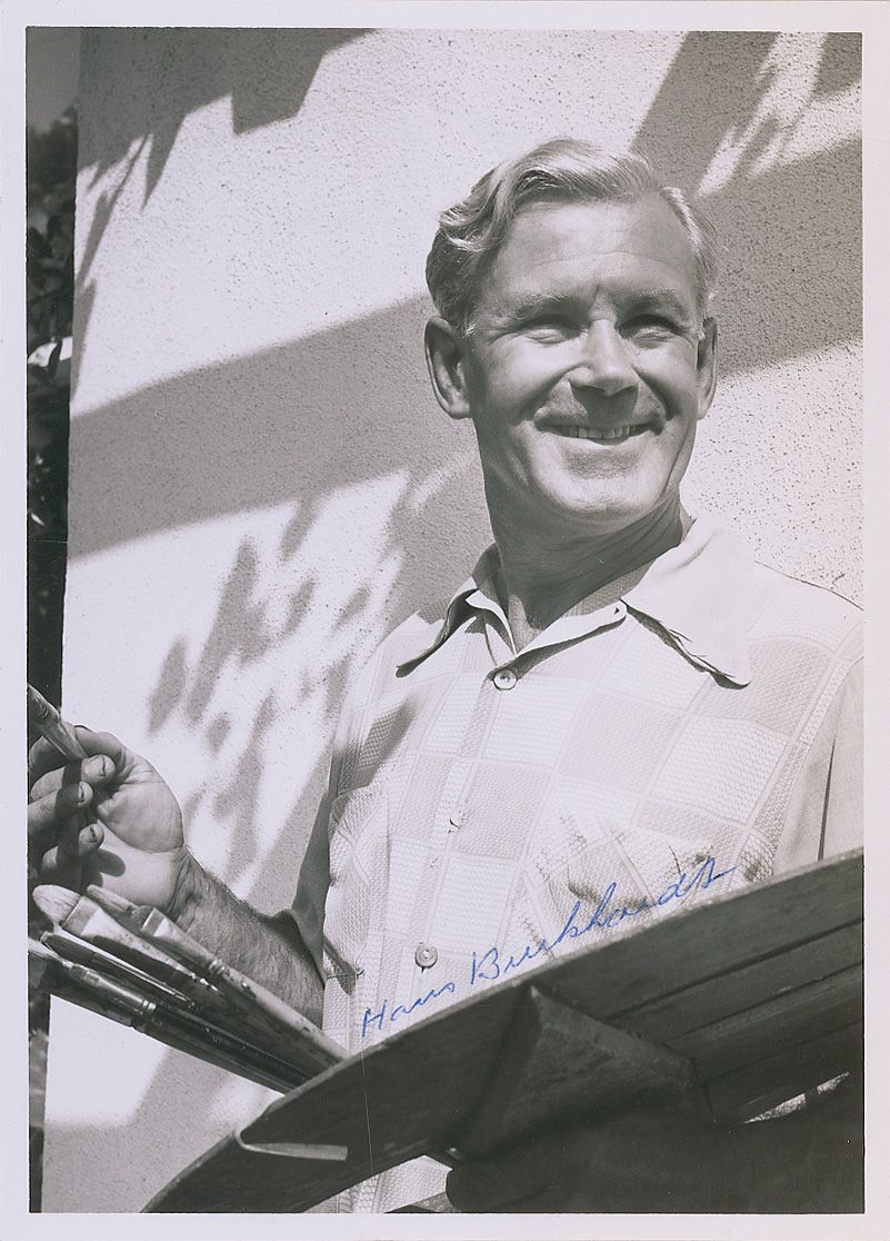 Swiss-American abstract expressionist (1904 –1994). Glossy 5 x 7 photo of Burkhardt with his paintbrushes, signed in blue ballpoint. Also signed and inscribed on the reverse, “To Michael Robuck, with all good wishes, Hans Burkhardt.” In fine condition, with some show-through and impressions from inscription on reverse.
