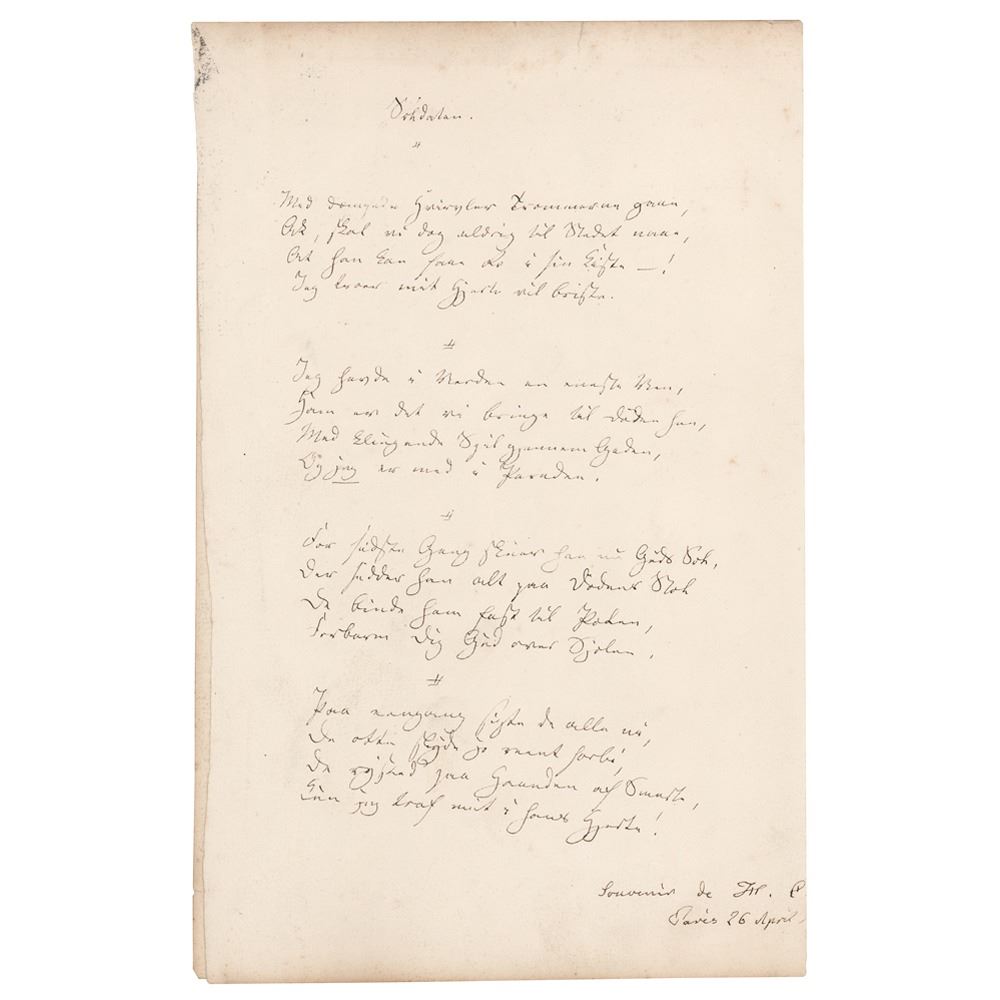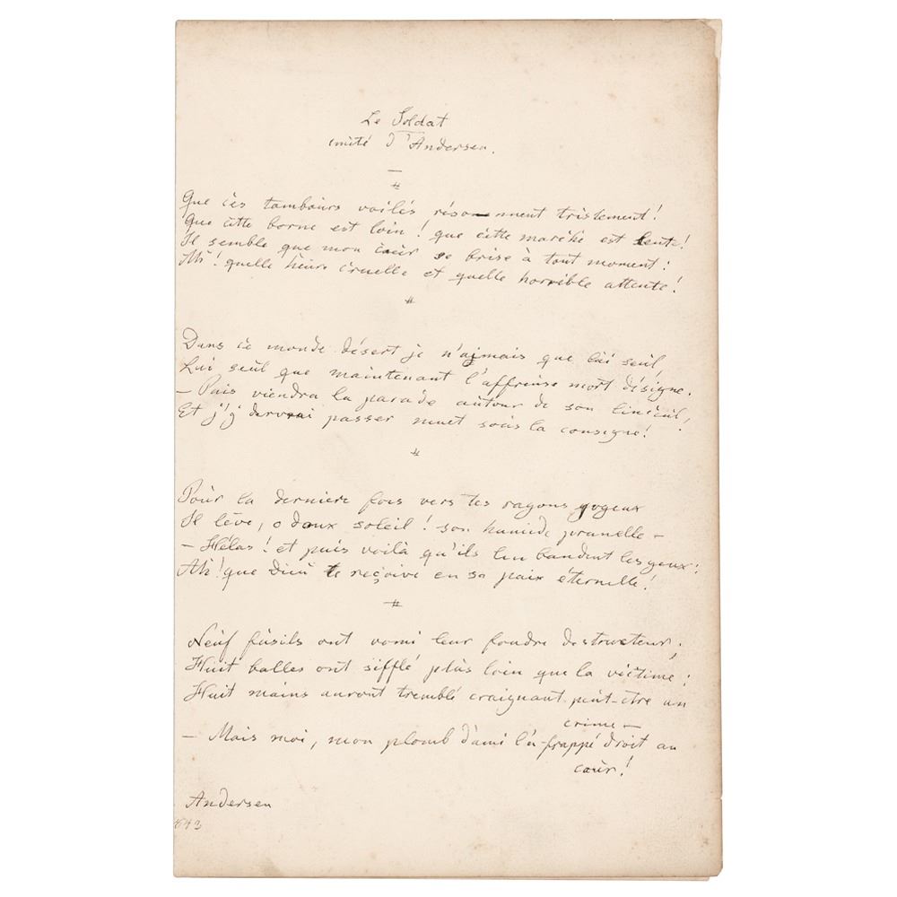 Fantastic autograph poems in Danish and French, one page, 13 x 10.25, signed at the conclusion, "Souvenir de H. C. Andersen, Paris 26 April 1843." Andersen pens four bilingual stanzas of one of his poems, headed "Le Soldat" on the French side. In very good to fine condition, with a trimmed left edge, some small edge tears, and reinforcement on the back of the separated central vertical fold. An impressive handwritten piece from the famed writer, whose literary manuscripts are very rare in the autograph market.