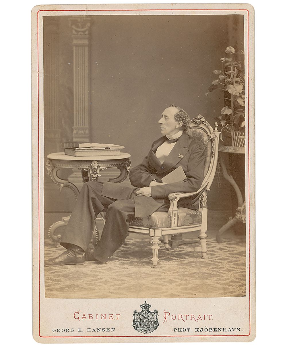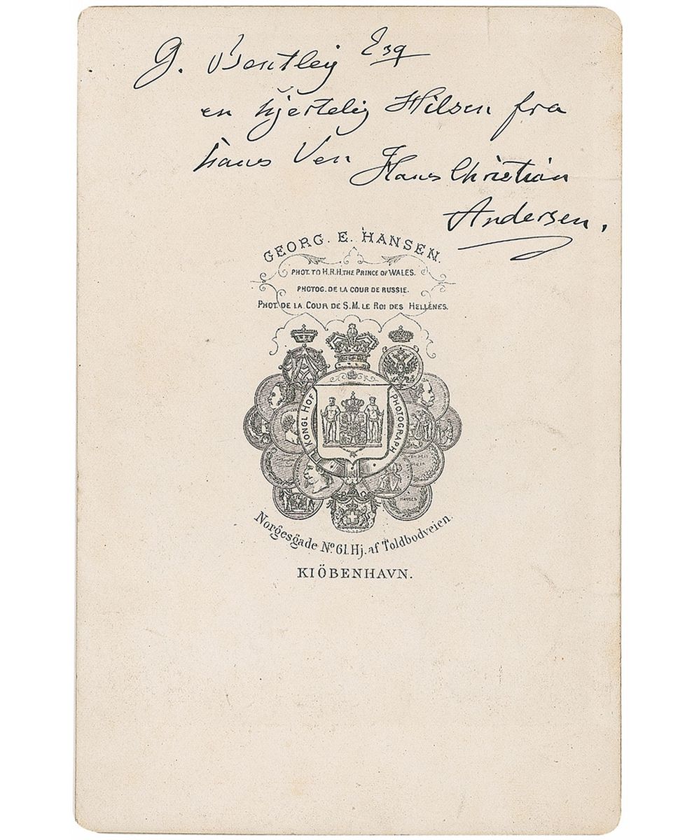 Beloved Danish author (1805–1875) best known for such classic fairy tales as The Ugly Duckling, The Red Shoes, and The Emperor’s New Clothes. Exceptional original 4.25 x 6.5 cabinet photo by G. E. Hansen of Copenhagen, showing a full-length image of Andersen seated at a small table, a book in his right hand, inscribed on the reverse in Danish to G. Bentley Esq., and signed “Hans Christian Andersen.” A couple creases and surface impressions to top left corner of image, and a few minor creases and light soiling to reverse, with one crease touching middle name of signature, otherwise fine condition. Andersen is quite uncommon in signed images, particularly of this size, condition, and quality.