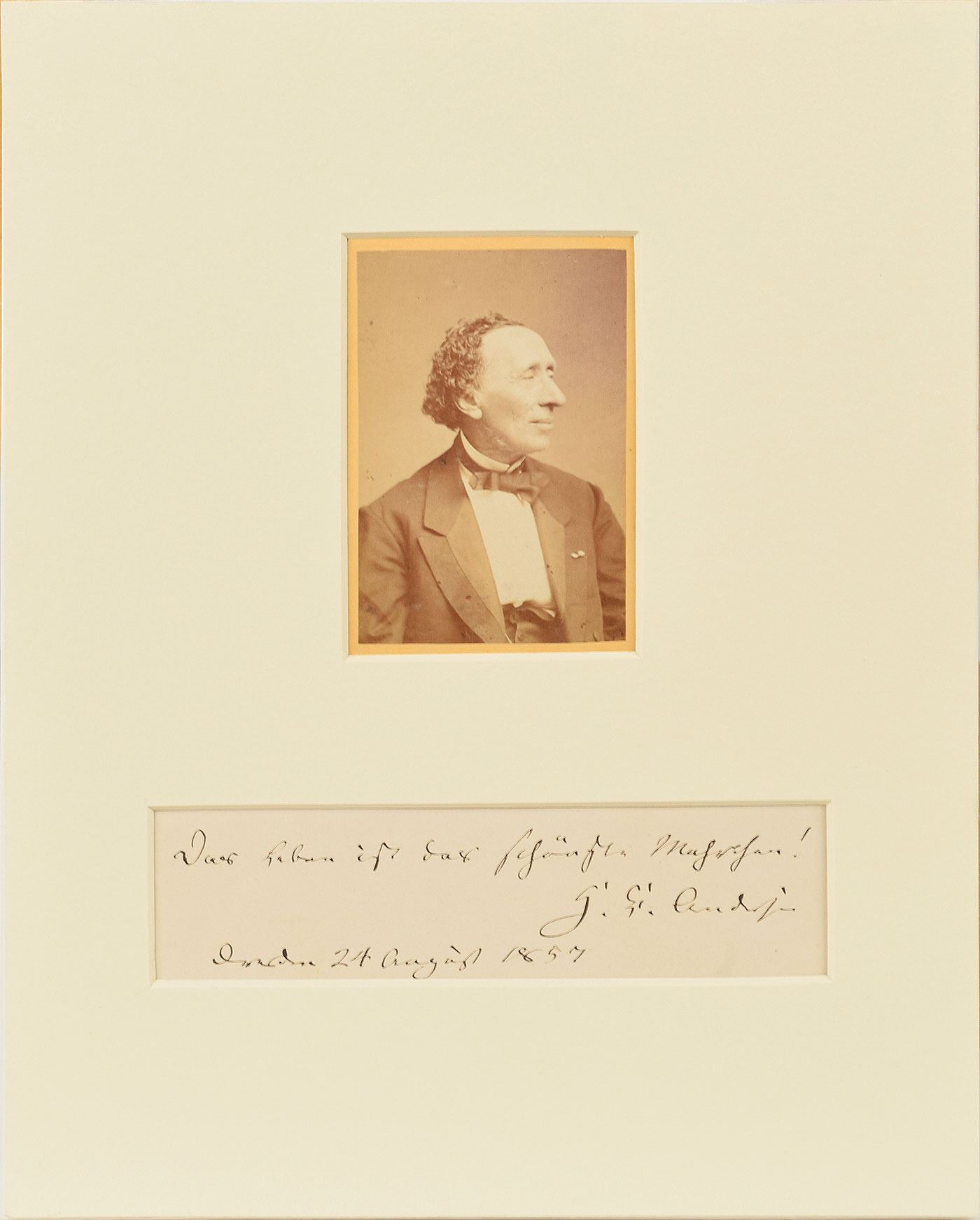Beloved Danish author (1805–1875) best known for such classic fairy tales as The Ugly Duckling, The Red Shoes, and The Emperor’s New Clothes. Fabulous AQS in German on an off-white 5.5 x 1.5 slip, in full (translated): "Life is the most beautiful fairy tale! H. C. Andersen, Dresden 24 August 1857." Elegantly matted with an original carte-de-visite portrait of the great author to an overall size of 8 x 10. In fine condition. An exemplary, beautiful quote from the esteemed writer of fairy tales.