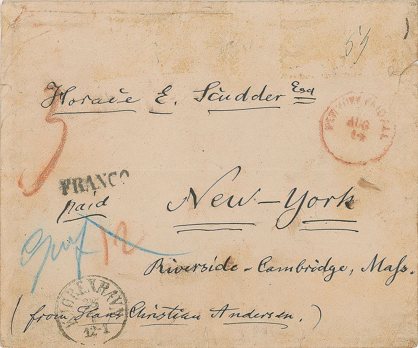 Beloved Danish author (1805–1875) best known for such classic fairy tales as The Ugly Duckling, The Red Shoes, and The Emperor’s New Clothes. Hand-addressed mailing envelope, 5.75 x 4.75, addressed by Andersen to his English translator, "Horace E. Scudder, Esq., New-York, Riverside-Cambridge, Mass., paid," and signed at the bottom, "(from Hans Christian Andersen)." In very good condition, with creasing, soiling, and central horizontal fold. In their published correspondence, Scudder once explained his process: 'I am pleased you are satisfied with the translation of your stories. I have put them into an exact English version and then go over them myself with great care, endeavoring to give those touches and quaint turns of expression with a long study of your writings has made me acquainted.' Andersen replied: 'I could not wish for a better translator than a man who is spiritually akin to me.' A fantastic example of Andersen's Anglicized autograph.