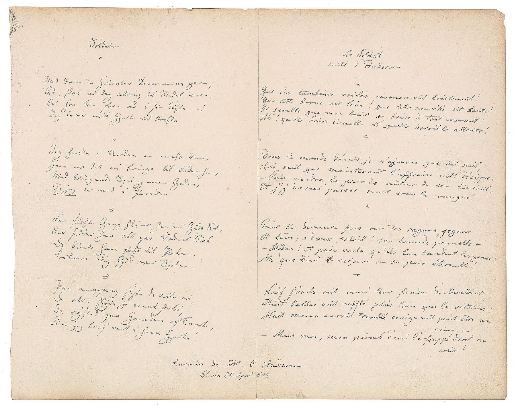 Beloved Danish author (1805–1875) best known for such classic fairy tales as The Ugly Duckling, The Red Shoes, and The Emperor’s New Clothes. Fantastic autograph poems in Danish and French, one page, 13 x 10.25, signed at the conclusion, "Souvenir de H. C. Andersen, Paris 26 April 1843." Andersen pens four bilingual stanzas of one of his poems, headed "Le Soldat" on the French side. In very good to fine condition, with a repaired central vertical separation. An impressive autograph piece from the famed writer.