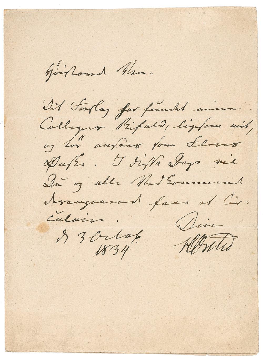 Danish physicist (1777-1851), he discovered the diversion of a magnetic needle by electric current, becoming the founder of the rule of electromagnetism. LS in Danish, signed “H. C. Oersted,” one page, 5.25 x 7.25, October 3, 1834. Crisply penned letter to his friend, the actor and writer Stephan Heger (1769-1855). In part: “Your proposal has met with the approval of my colleagues as well as with my own and may be considered the wish of many. Within the next days, you and all to whom it may concern will receive a newsletter.” Second integral page bears an address panel in another hand. In fine condition, with intersecting mailing folds, a uniform shade of toning, and a few unobtrusive spots.