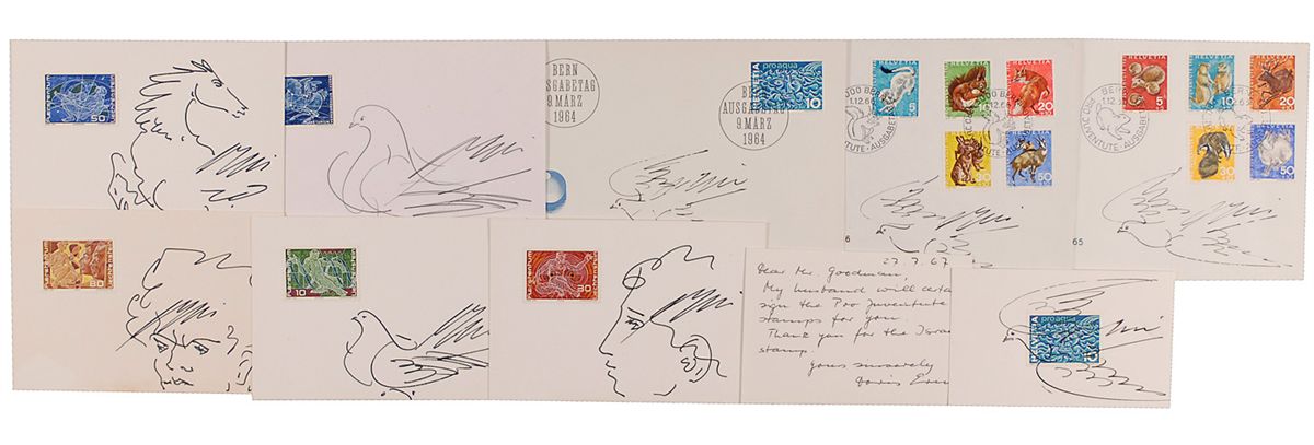 Swiss painter and sculptor. Nine original ink and pencil sketches of of birds, horses, and two human heads, on individual off-white cards and envelopes, ranging in size from 4 x 2.5 up to 6.25 x 4.5, with a least one postage stamp affixed to each sketch. In overall fine condition. Accompanied by a 1967 ALS from Erni’s wife.
