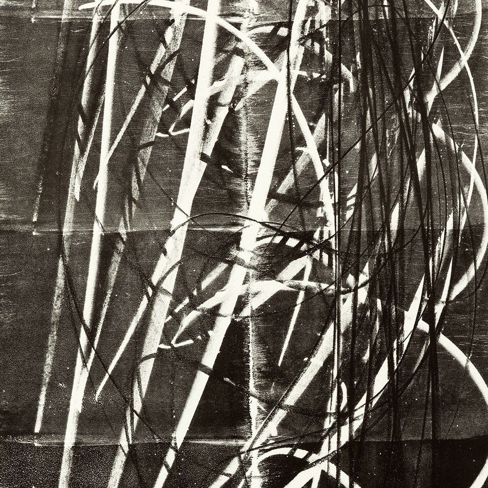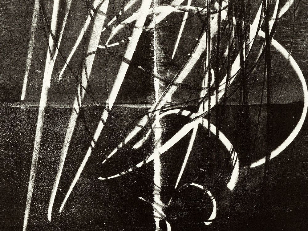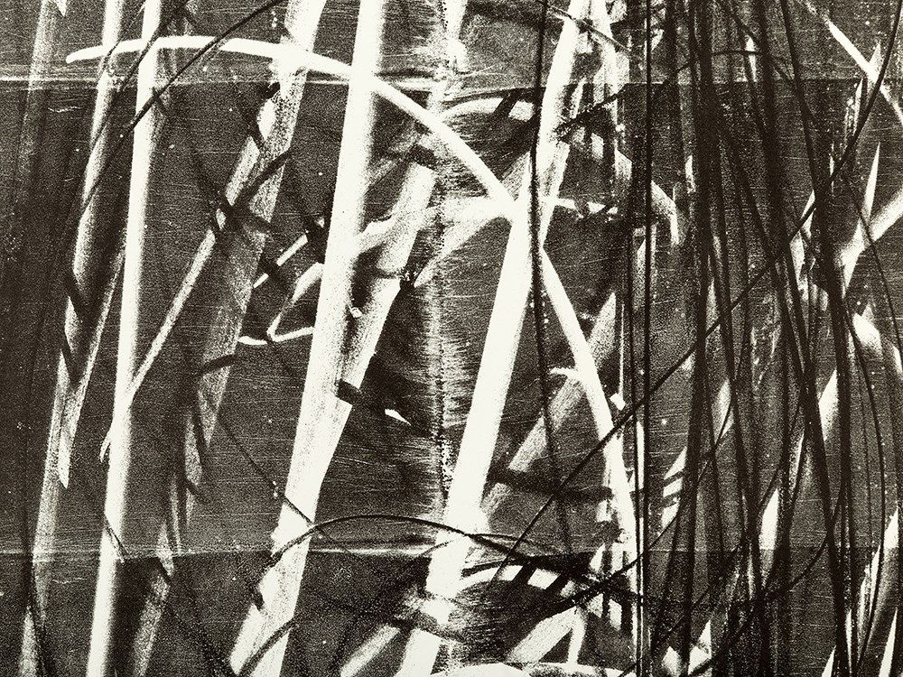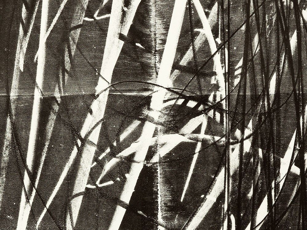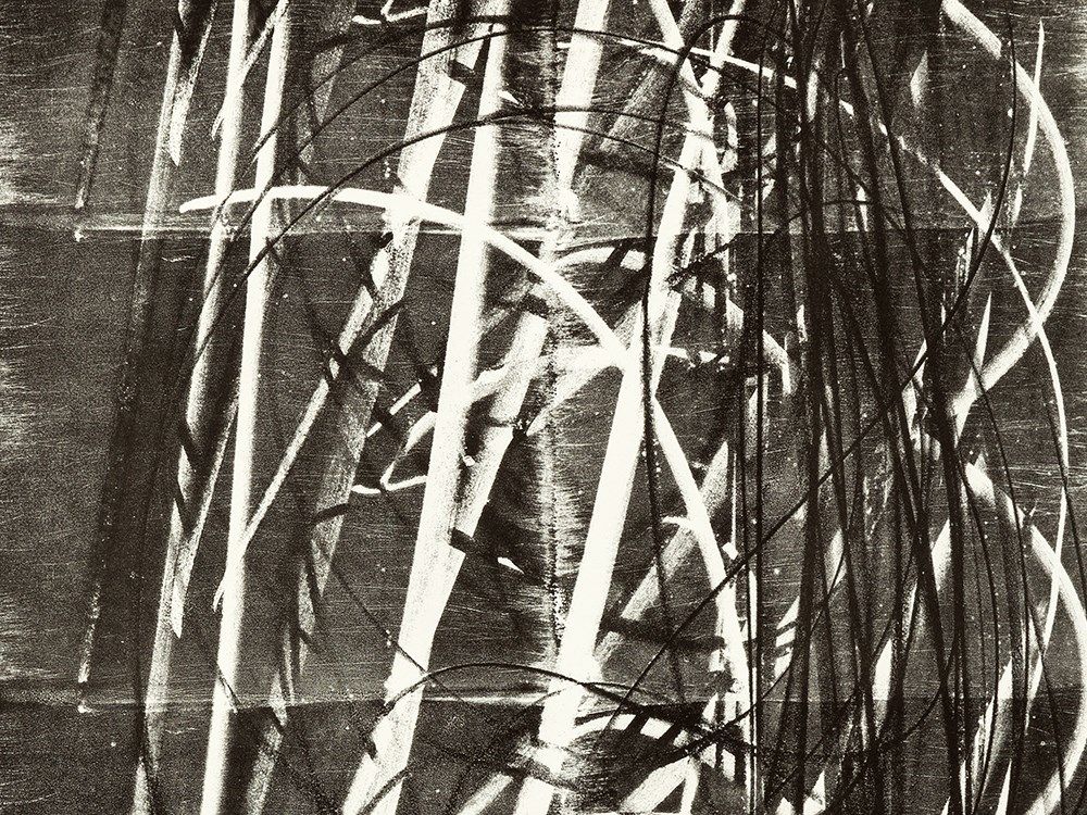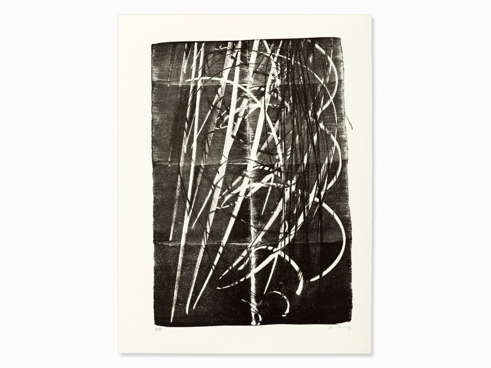 In this lithograph vertical and in circle-shape drawn gestural lines are laid on a ground which is horizontally structured. It is a typical work by the artist, who is an important representative of the Informel.