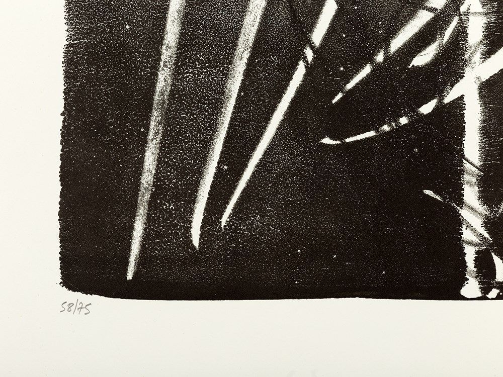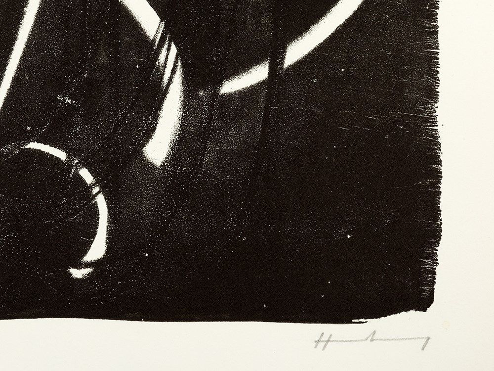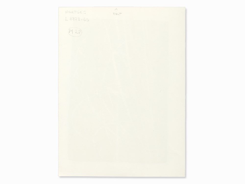 The aquatint at hand is signed lower right in pencil ‘Hartung’ and numbered lower left in pencil ‘58/75. There is a tiny and insignificant stain in the lower margin, the sheet is in very good condition. The image measures 63.8 x 45 cm, the sheet measures 76.2 x 56.8 cm.