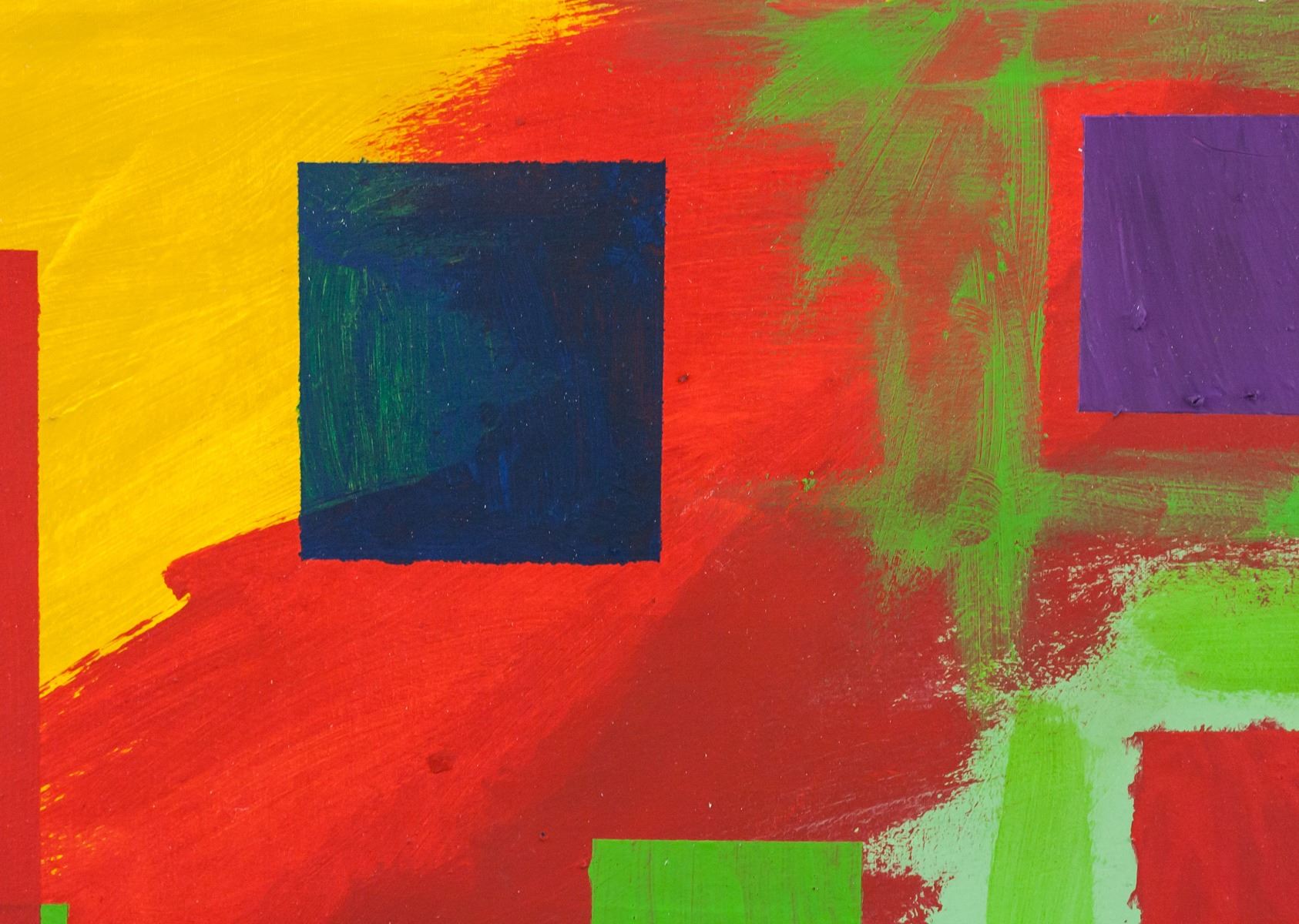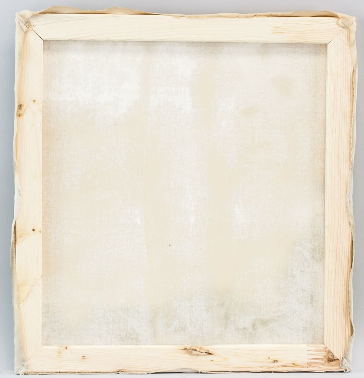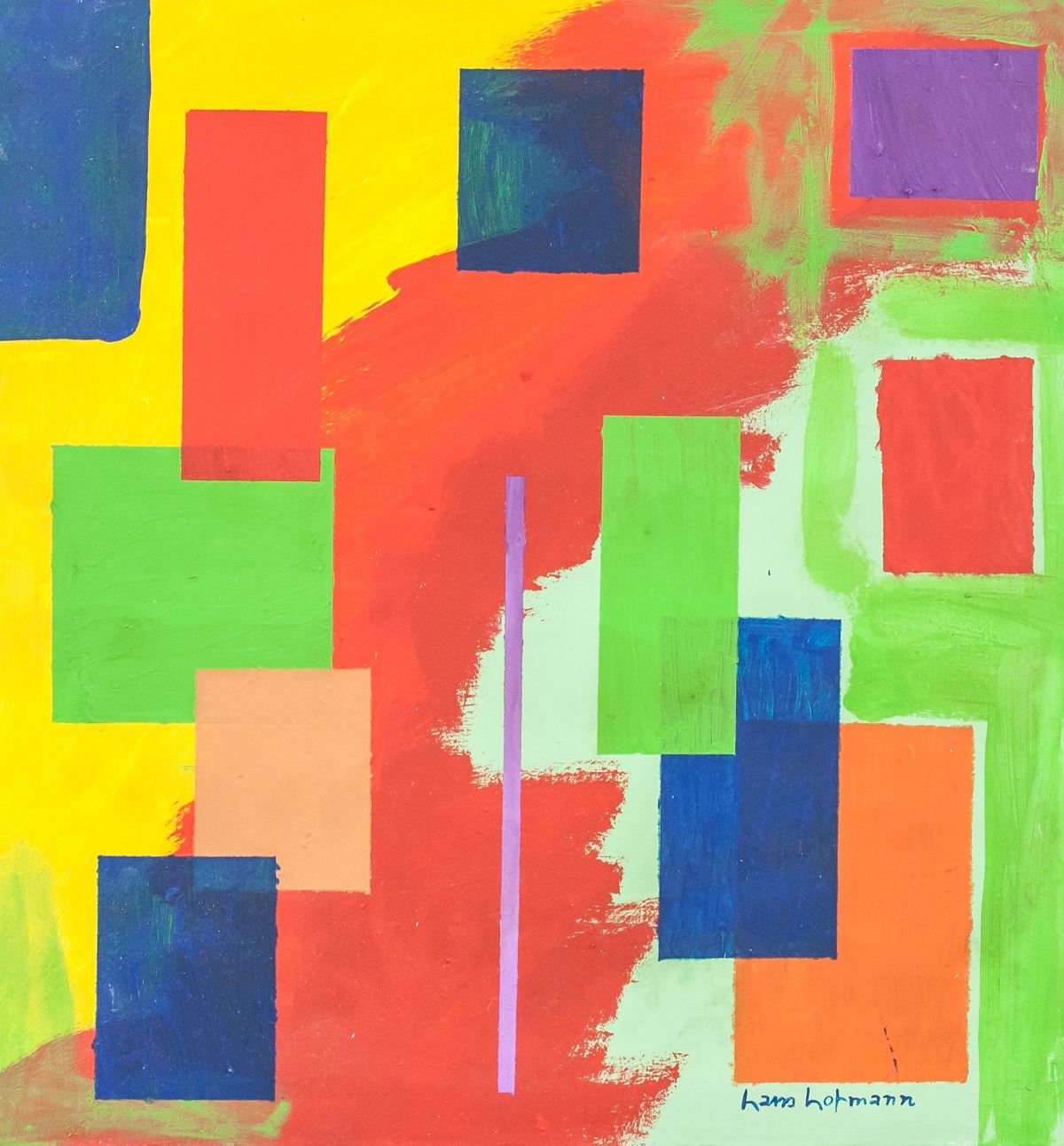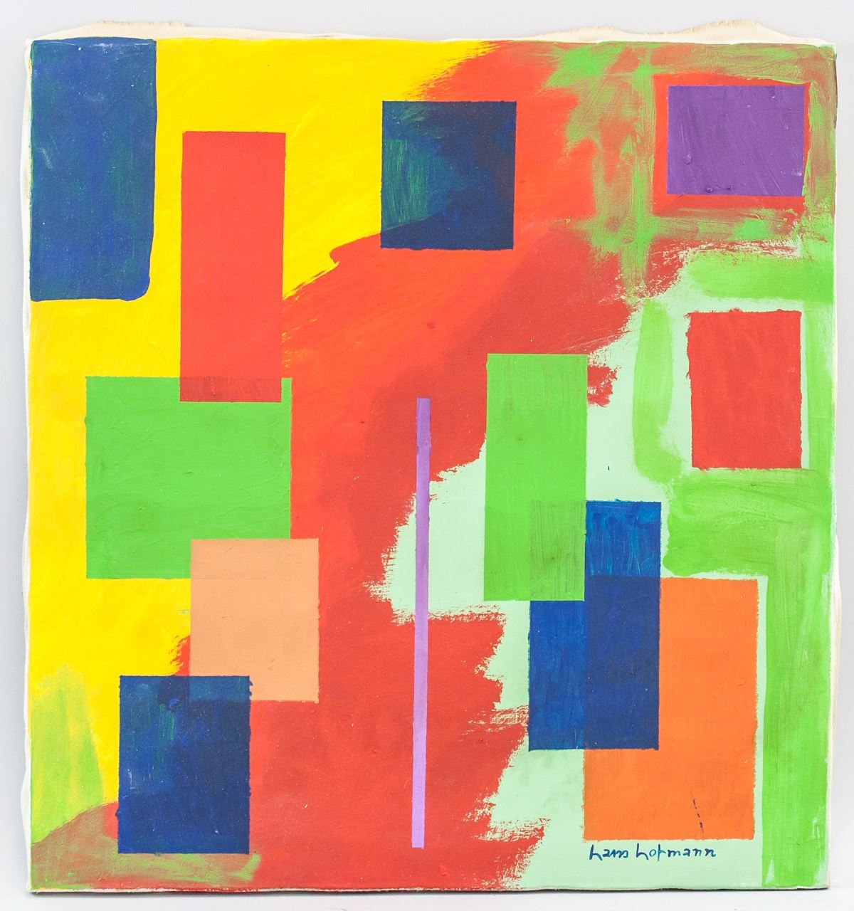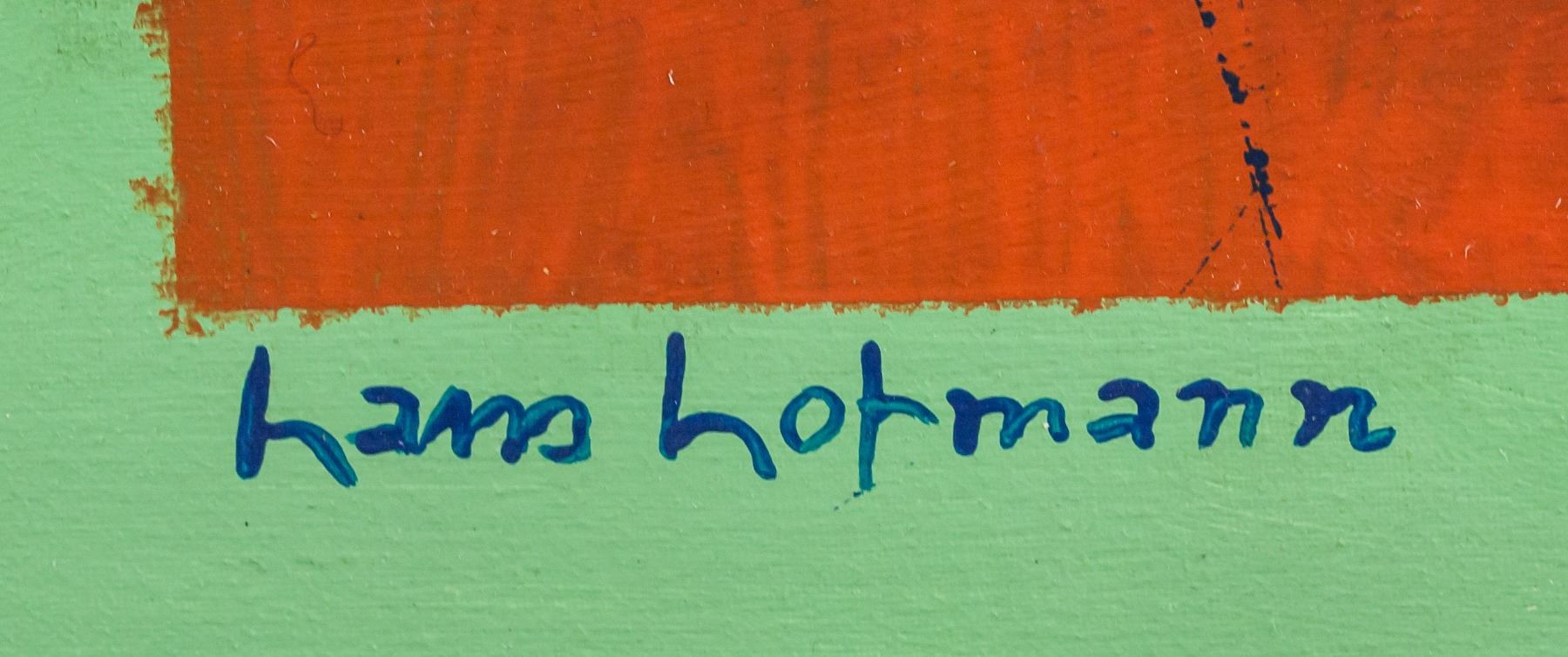 Oil on canvas. Featuring abstract composition of solid squares of color against a colorful background. Signed "hans hofmann" to the bottom right. Attributed to Hans Hofmann (1880-1966, American). 50 x 47 cm (19.75 x 18.5 in).