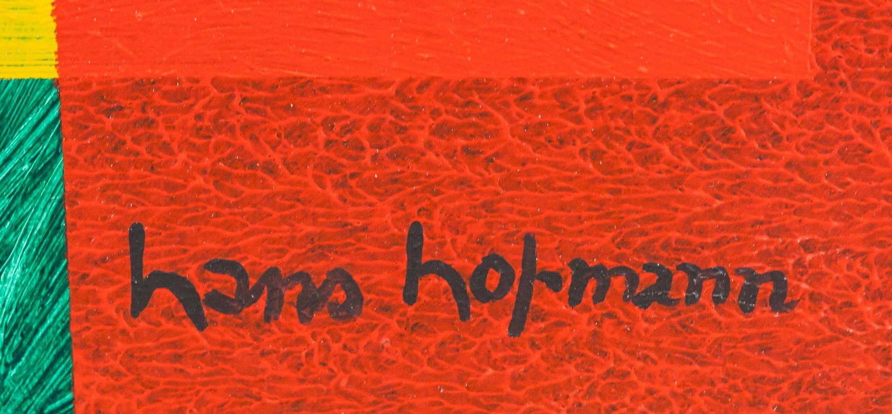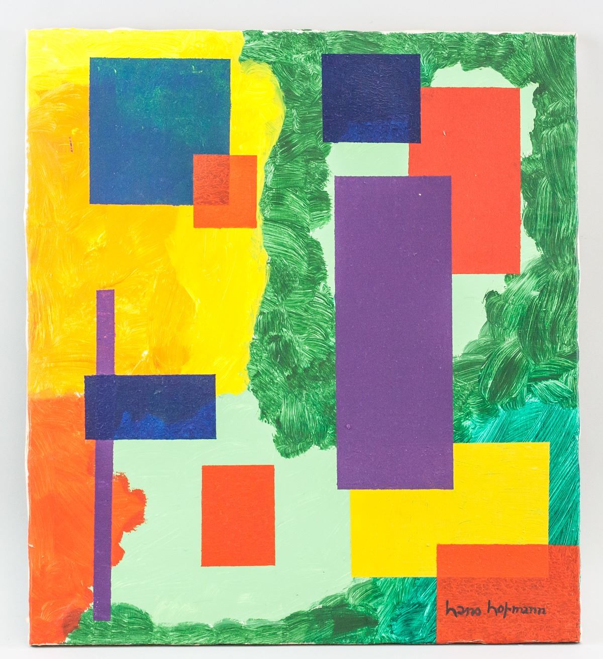 Oil on canvas. Featuring solid colored squares and rectangles against a colorful background. Signed "hans hofmann" in the bottom right corner. Attributed to Hans Hofmann (1880-1966, American). 48 x 43 cm (19 x 17 in).
