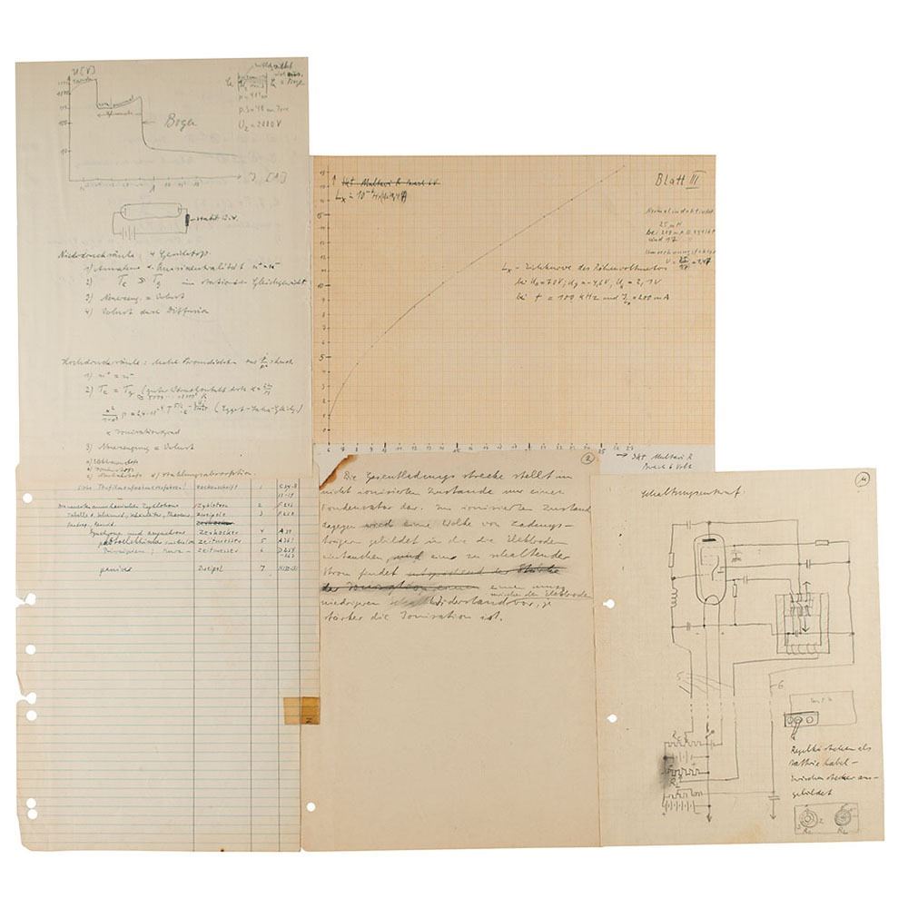 Five pages of handwritten notes by Hans Hosenthien (one double-sided), including a hand-drawn chart, electrical schematic, graph with notes and equations, and two pages of writing in German. In overall fine condition.