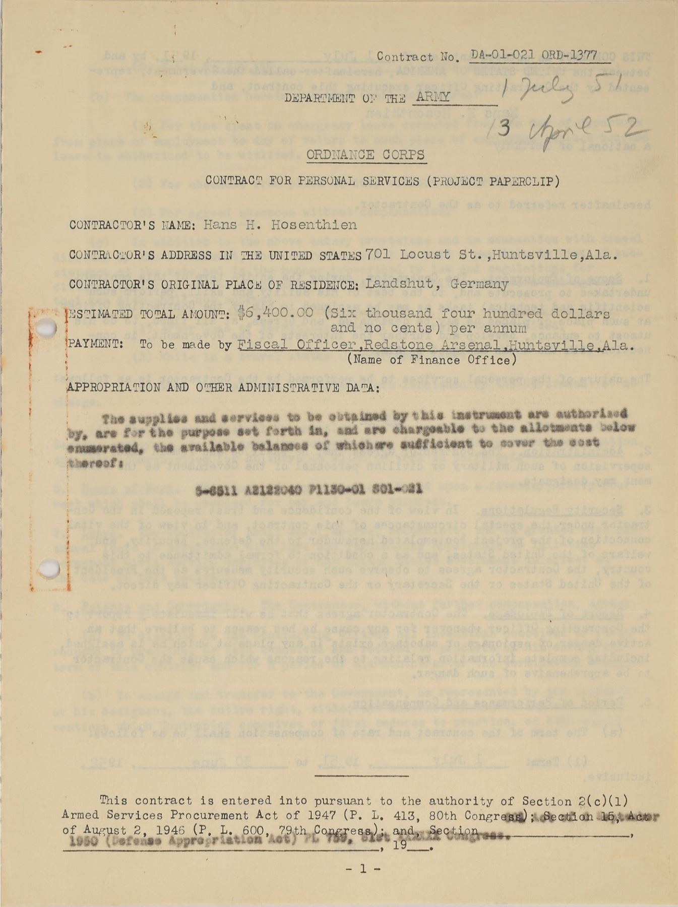 German rocket scientist and engineer (June 26, 1915–July 3, 1996) who arrived in America under Project Paperclip on November 16, 1945. He worked with the Von Braun led rocket team at Fort Bliss, White Stands, and Huntsville, and later became head of the Flight Dynamics Branch, Guidance and Control Division at NASA's Marshall Space Flight Center. DS, signed “Hans H. Hosenthien,” seven pages, 8 x 10.25, July 1, 1951. Department of the Army contract between Hosenthien and the Ordnance Corps, in which the former agrees to offer his personal services for the term of one year in "Project Paperclip," for the estimated total amount of $6,400. Section 1, entitled "Scope of Employment," in part: "The Contractor, during the entire term of his contract, undertakes to prosecute and, to the best of his ability and skill, perform such scientific and technical tasks as may be assigned to him by the Contracting Officer…The nature of the personal services to be performed by the Contractor is as follows: GS–12." Signed at the conclusion by Hosenthien, Major James P. Hamill as the Contracting Officer, and witnesses Lillian Kelly and Lila Baker of OGMC, Redstone Arsenal, Huntsville, Alabama. In fine condition, with a small band of rust remnant to left edge of first page. From the collection of aerospace memorabilia specialist Ken Havekotte.