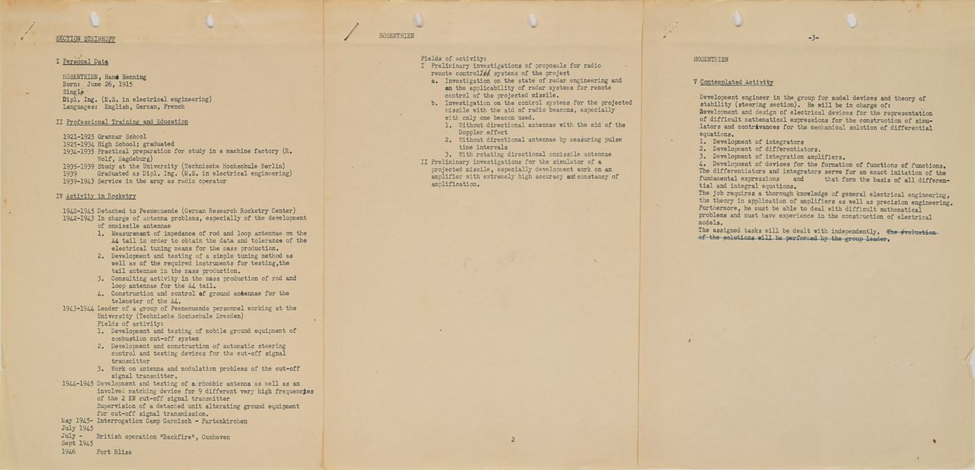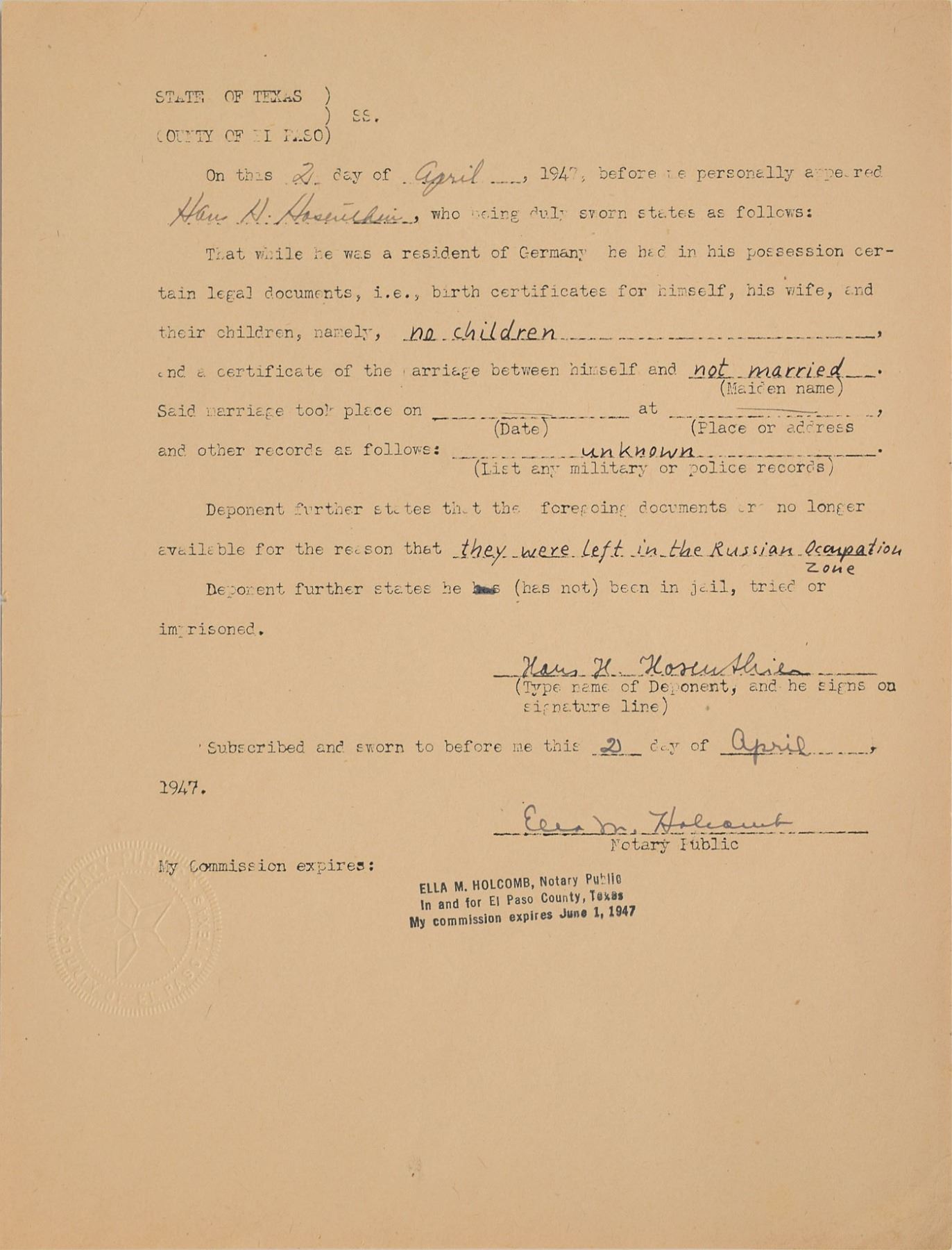 German rocket scientist and engineer (June 26, 1915–July 3, 1996) who arrived in America under Project Paperclip on November 16, 1945. He worked with the Wernher von Braun rocket team at Fort Bliss, White Stands, and Huntsville, and later became head of the Flight Dynamics Branch, Guidance and Control Division at NASA's Marshall Space Flight Center. DS, signed “Hans H. Hosenthien,” one page, 8 x 10.5, April 2, 1947. State of Texas, County of El Paso sworn affidavit made by Hosenthien, in which he states that, as "a resident of Germany," he was not married, had no children, and maintained no other military or police records. He further states that all related documents are no longer available "for the reason that they were left in the Russian Occupation Zone." Hosenthien also notes that he has never been in jail, tried, or imprisoned. Includes a three page biography sheet for Hosenthien, which consists of four sections: Personal Data, Professional Training and Education, Activity in Rocketry, and Contemplated Activity, which notes that he will work as a "Development engineer in the group for model devices and theory of stability (steering section)." In very good to fine condition, with toning, edge chips, staple and file hole punches to biography sheet. From the collection of aerospace memorabilia specialist Ken Havekotte.