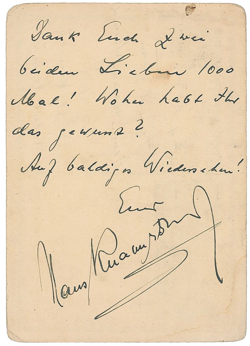 German conductor (1888–1965) best known for his performances of Richard Wagner, Anton Bruckner, and Richard Strauss. ALS in German on a 4 x 5.75 postcard, postmarked Vienna, March 21, 1938. Brief letter expressing thanks. In full (translated): “Thank you both loved ones 1000 times. How could you know this? Hope to see you soon.” Scattered soiling, otherwise fine condition. On the day this was postmarked, Knappertsbusch conducted one of the most historically important concerts of his life, leading the Vienna Philharmonic at a festival concert marking the reunification of Austria with the German Empire; the highlight of the night was the performance of Bruckner’s Eighth Symphony.