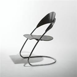 Hans Luckhardt ST 14 prototype Thonet Germany, 1932 chromed steel, plywood 21"w x 22"d x 34.5"h The poetic form of Hans Luckhardt's ST 14 transcends the cantilever principle set forth a few years earlier by Breuer, Mies and Stam. Rigid geometries are replaced with fluid streamlining supporting a seemingly weightless seat. The design was initially developed for production by Desta in 1931. Desta was sold by Anton Lorenz to Thonet who took on the design in 1932. Thonet never actually produced the chair, however, and only a small stock of the design received from Desta was ever sold by Thonet. This example does retain a early metal plaque by Thonet with a bent wood chair, used by Thonet until 1935 when it was changed to the tube steel logo. The struts differ from the production model from Desta, as Thonet attempted to redesign the structure to give it a cleaner line and to make the design more feasable for mass production. This example is a working prototype of the chair. Literature: 100 Masterpieces from the Vitra Design Museum, Von Vegesack, pg. 108-109 Deutsche Stahlrohr Mobel, Von Vegesak, cover and pg. 47, 49 Bent Wood and Metal Furniture 1850-1946, Ostergard, pg. 294, fig. 85 This chair has been authenticated by the Bauhaus Archiv in Berlin and Thonet Germany.