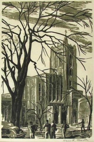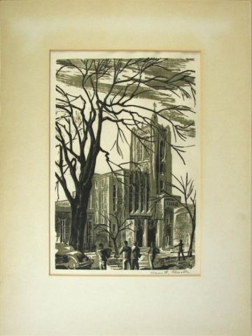 Hans Mueller, Woodblock , (5551) Hans Alexander Mueller (1888-1963) (New York) Woodblock, Cathedral, 11 3/4" x 8" sight, Pencil Signed Lower Right, Small punch thru in center of image