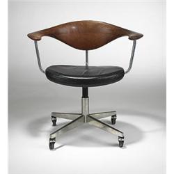 Hans Wegner Swivel Desk Chair Johannes Hansen Denmark, 1955 teak, leather, chrome steel 29"w x 24"d x 29"h