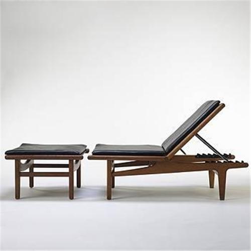 Hans Wegner<BR>adjustable lounge and ottoman<BR>Andr Tuck<BR>Denmark, c. 1955<BR>teak, canvas, leather<BR>30"w x 73"d x 27"h<BR><BR><BR><BR><BR><BR>