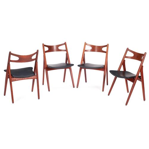Hans Wegner chairs, four, by Carl Hansen, Denmark, teak frames with bent wood backs and black leather upholstery, original finish, all with stamped and burned marks, 20.5"w x 20"d x 32.5"h, reupholstered, very good condition