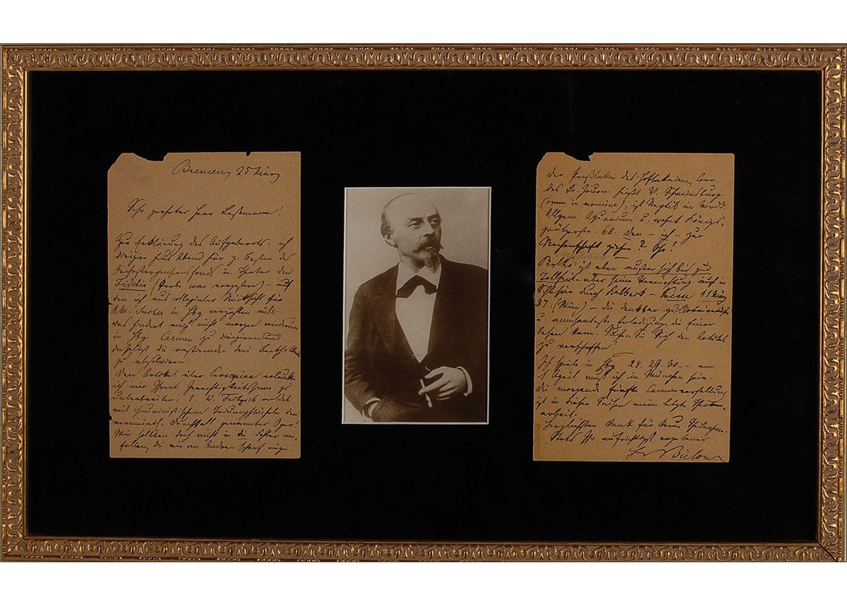 Pianist and as a conductor, became a piano pupil of Liszt. Untranslated ALS in German, signed “H. Bulow,” two pages, the second embossed in the lower right corner, 4.5 x 7, May 25. The famed musician composes a gracefully-penned letter. Velvet-matted and framed, with an image of the pianist with a cigar, to an overall size of 19 x 12. In fine condition, with mild paper loss to the top edges of each page and a few trivial adhesive remnants.