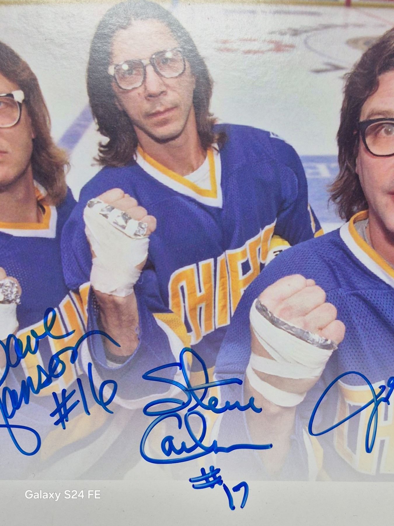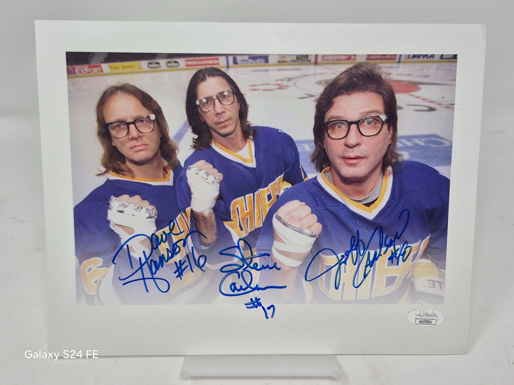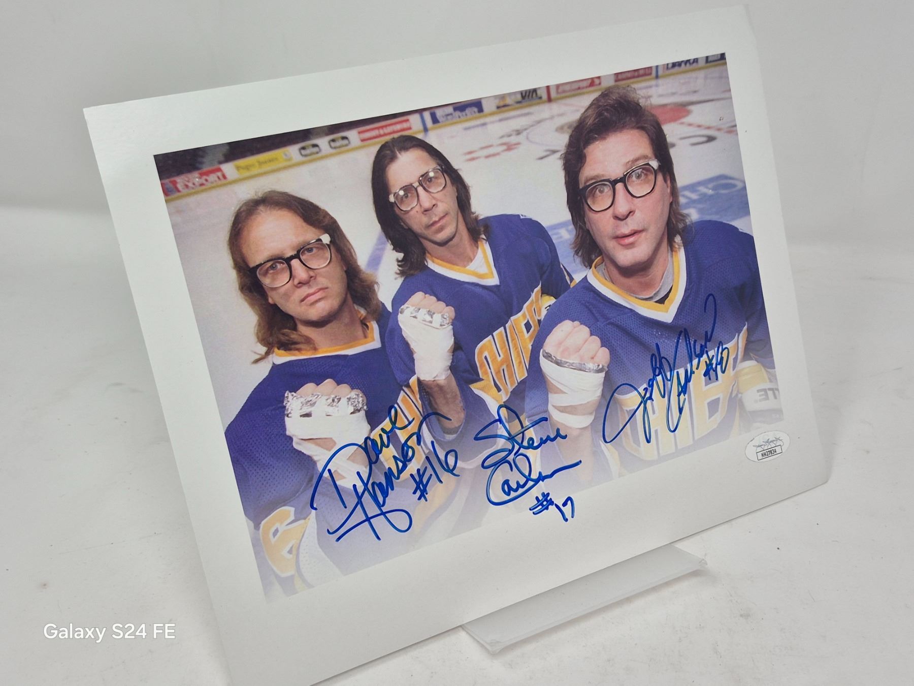 Autographed photo of the iconic Hanson Brothers from the classic hockey film "Slap Shot," signed by Dave Hanson (#16), Steve Carlson (#17), and Jeff Carlson (#18). Includes JSA authentication.