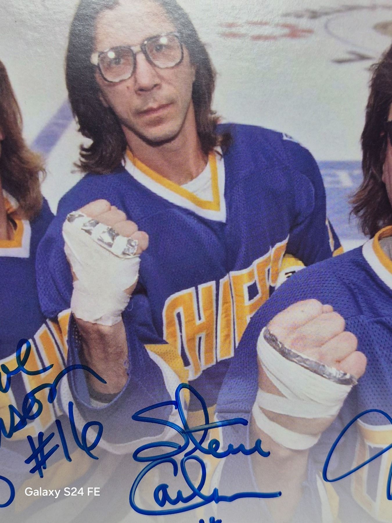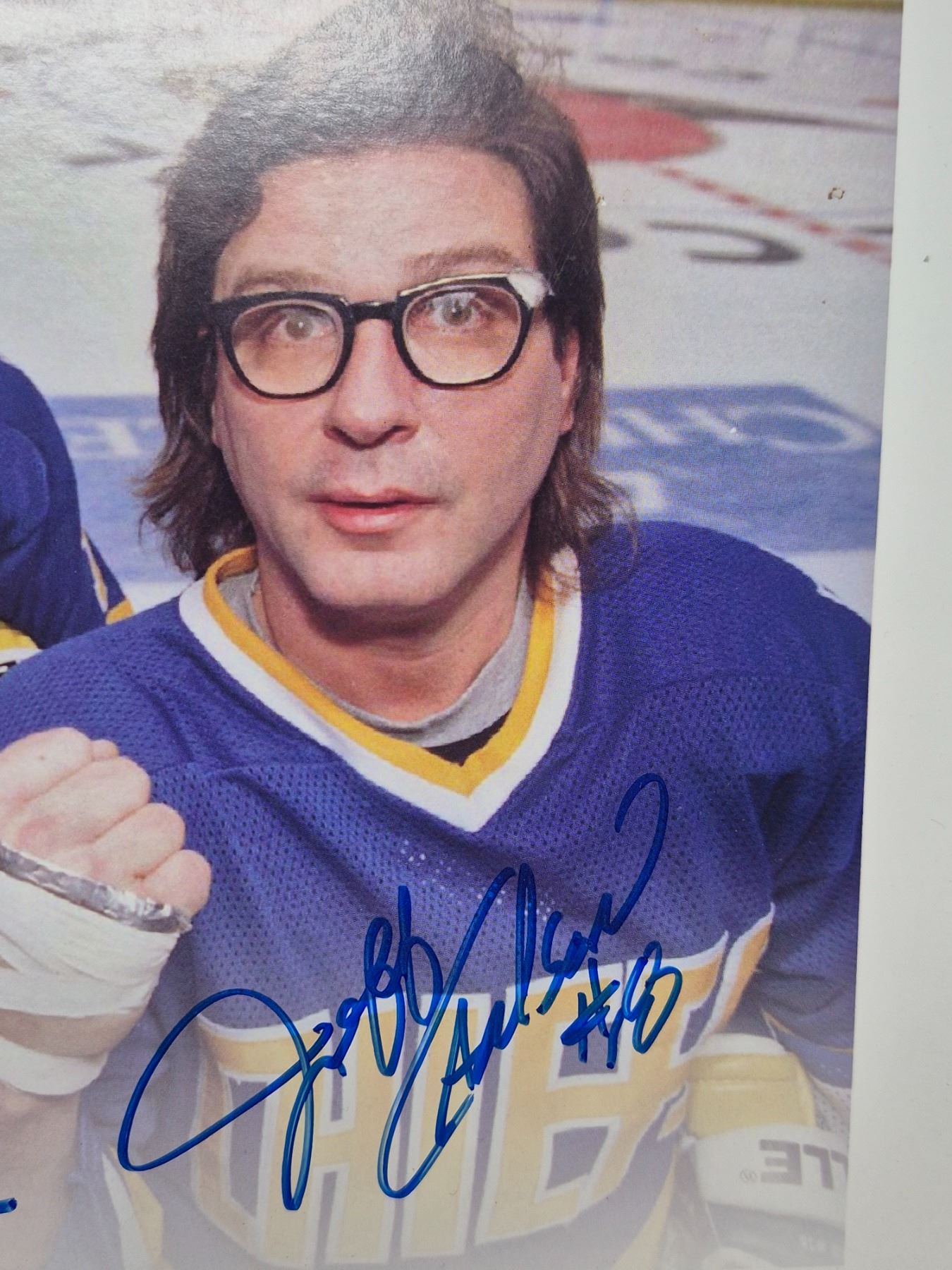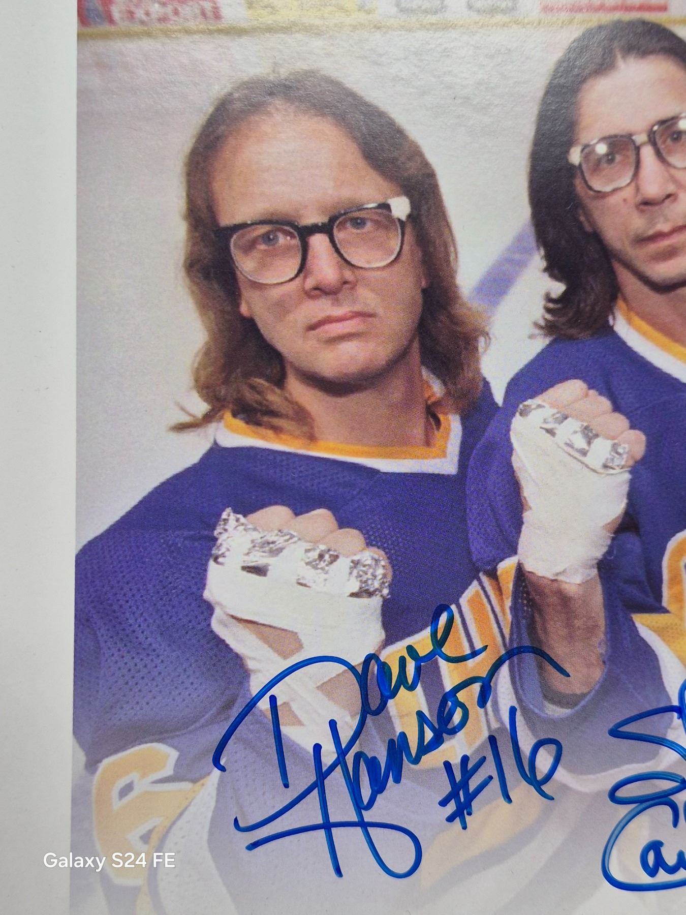 Autographed photo of the iconic Hanson Brothers from the classic hockey film "Slap Shot," signed by Dave Hanson (#16), Steve Carlson (#17), and Jeff Carlson (#18). Includes JSA authentication.