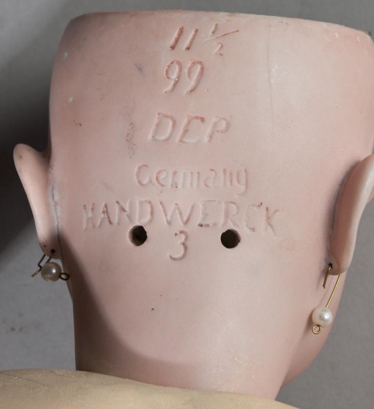 Head marked 11 & 1/2 99 Dep Germany 3.  Replaced legs and hands. Lacking clothes, eyes and wig.  Head 12" Dia., body size 16" L, doll height 21" L.