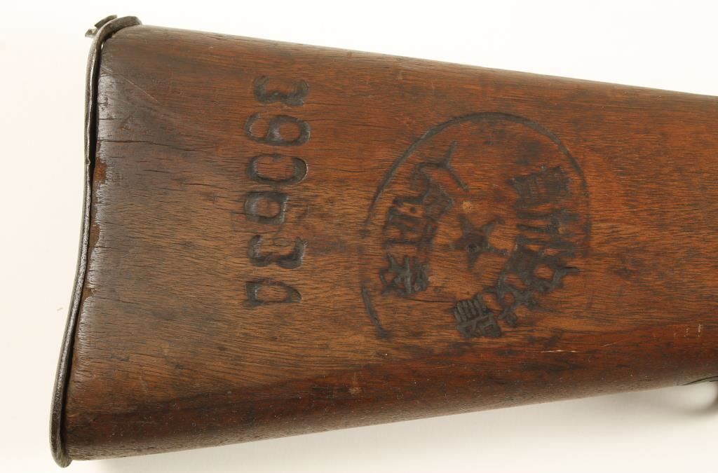 Chinese military blued bolt-action rifle with a 29" barrel. Metal finish has turned to brown with pin-prick pitting over action and barrel and deep pitting on the buttplate. Wood is dark with a large cartouche and number on the butt. Edges are rounded and a large chip is missing out of the forend barrel channel but most of the wood damage is small. Bore is dark with some rifling. Action is working well. Condition is poor. *Modern Firearm*