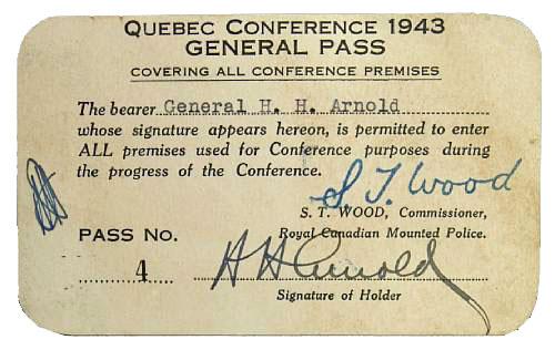 General Hap Arnold signed admission ticket to the Quebec Conference, held 14-24 August 1943. Ticket reads ''Quebec Conference 1943 / General Pass / Covering All Conference Premises / The bearer 'General H.H. Arnold' / whose signature appears heron, is permitted to enter ALL premises used for Conference purposes during the progress of the Conference.'' Countersigned in blue ink by the Commissioner of the Royal Canadian Police. Ticket is numbered ''4'' at lower left. Small scribble on left side of ticket, else near fine.