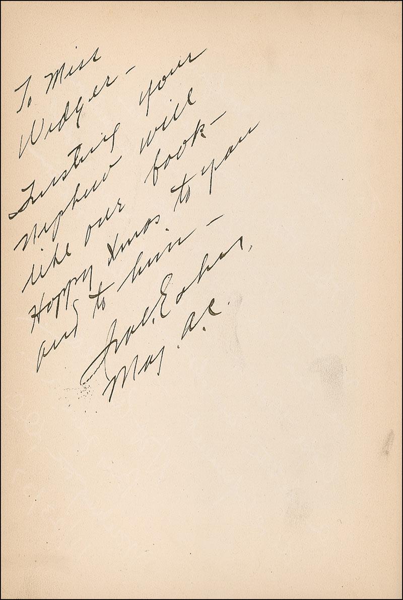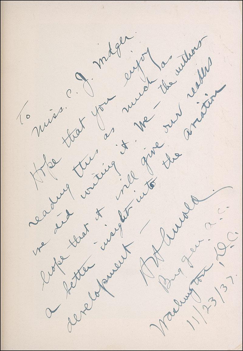 Signed book: This Flying Game. Later printing. NY: Funk and Wagnalls, 1936. Hardcover, 6.5 x 9.25, 275 pages. Lengthily inscribed on the second free end page and signed “H. H. Arnold, Washington D.C., 11/23/37,” and signed and inscribed on the reverse of the first free end page by Eaker. In very good condition, with uniform mild toning to inside pages, a bit of light soiling to Eaker’s signed page, hinges a bit weak, but intact, and scattered wear, soiling, and rubbing to covers and spine.