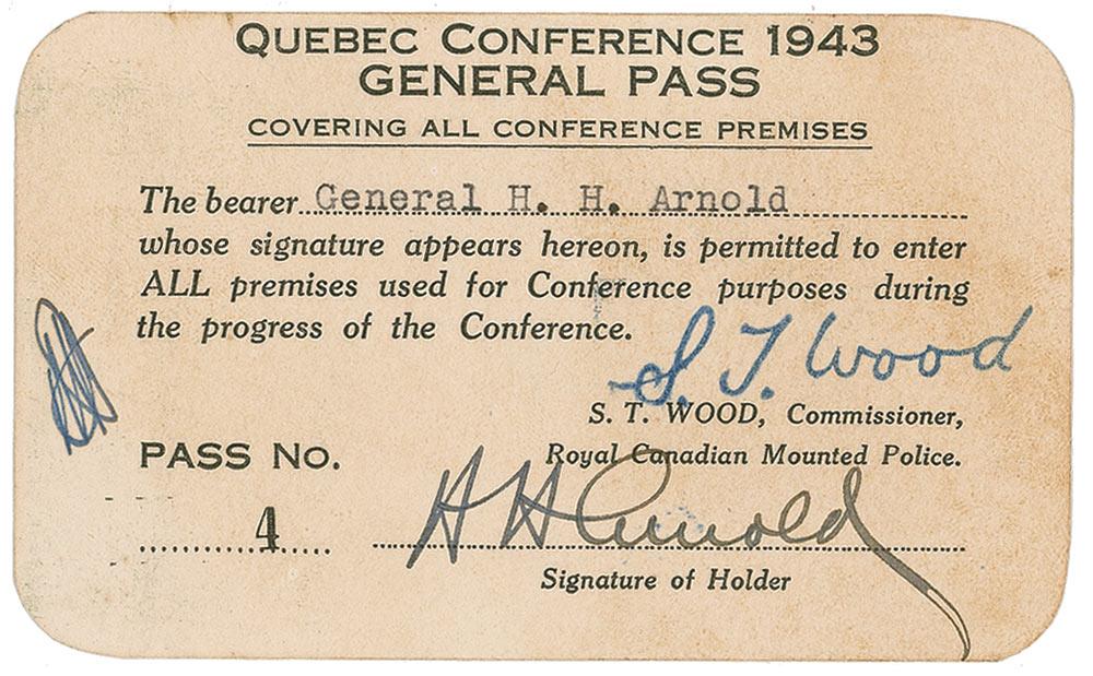 War-dated Quebec Conference general pass, signed “H. H. Arnold,” 4.5 x 2.75, 1943. General Pass for the 1943 Quebec Conference issued to Arnold, signed at the conclusion in fountain pen by Arnold, and also bearing a stamped signature of RCMP Commissioner S. T. Wood. Reverse bears a Herbert H. Smellie, Security Officer stamp. Scattered light toning and soiling, and some ink marks to left side, otherwise fine condition.