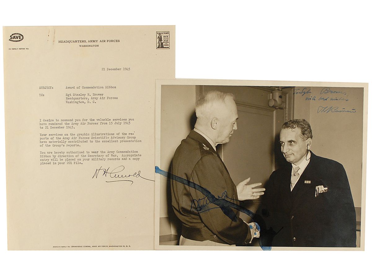 Two items: one typed memo signed “H. H. Arnold,” one page, 8 x 10.5, Headquarters, Army Air Forces letterhead, December 21, 1945, in part: “Your services on the graphic illustrations of the reports of the Army Air Forces Scientific Advisory Group have materially contributed to the excellent presentation of the group’s reports. You are hereby authorized to wear the Army Commendation Ribbon by direction of the Secretary of War”; and a vintage matte-finish 10 x 8 photo of Arnold and Dr. Theodore von Karman, signed in fountain pen by Arnold and signed and inscribed to Brower by von Karman. Memo is in fine condition, with light creases and toning, and a paperclip mark and impression to the top; the photo, however, had ink spilled on it at the time of signing, obscuring part of Arnold’s signature in addition to a few light creases and silvering to the dark areas of the image. Arnold had been so impressed with the work of members of the Scientific Advisory Group’s illustrators that he asked for a medal to be created to honor them, with Brower chosen as the designer. The photos show Arnold presenting the group with their ‘medals’—in actuality, they had not yet been struck, so Brower created cardboard versions for the event. Accompanied by an unsigned photo of the medal presentation and a letter of provenance from Brower’s brother, fully explaining the history behind the items.