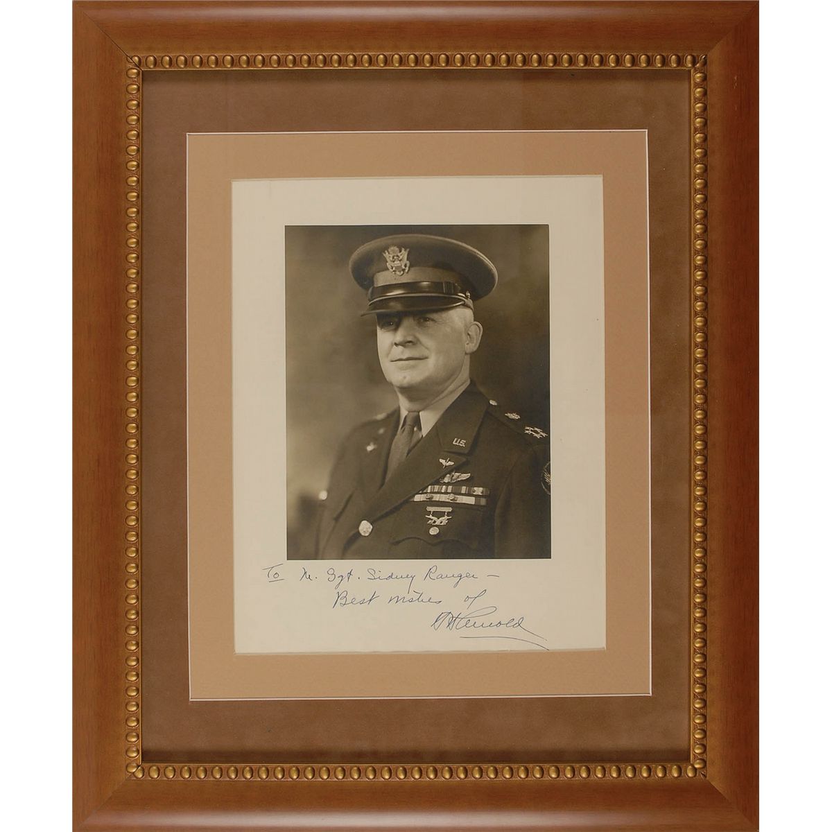 General (1886–1950) who helped develop the Air Force into a unified separate service. Vintage matte-finish 7.5 x 9.25 photo of Arnold in full military uniform, affixed to its original 10.5 x 13.5 mount, signed and inscribed on the mount in fountain pen “To M. Sgt. Sidney Ranger—Best wishes of H. H. Arnold.” Double matted and framed to an overall size of 19.5 x 23.75. Moderate silvering to darker areas of image and a few creases to mount, otherwise fine condition.