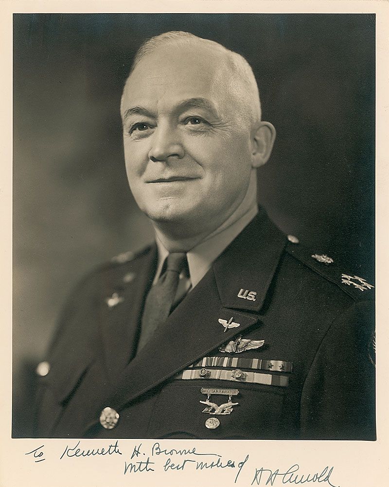 Vintage matte-finish 8 x 10 photo, signed and inscribed in the lower border in black ink, “To Kenneth H. Browne, with best wishes of H. H. Arnold.” Some vertical ripples, paperclip impression along top edge, and some silvering to edges, otherwise fine condition.