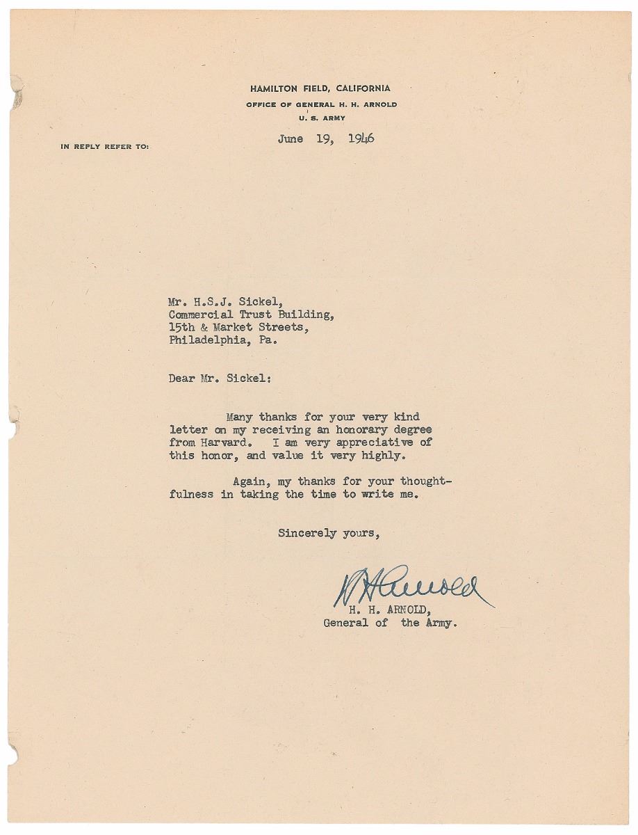 TLS signed “H. H. Arnold,” one page, 8 x 10.5, Hamilton Field, California letterhead, June 19, 1946. Letter to H. S. J. Sickel, in full: “Many thanks for your very kind letter on my receiving an honorary degree from Harvard. I am very appreciative of this honor, and value it very highly. Again, my thanks for your thoughtfulness in taking the time to write me.” In fine condition, with intersecting folds and three binding chips to left edge.