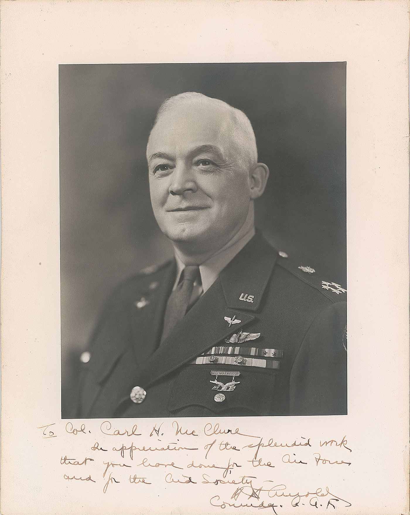 Handsome matte-finish 10.75 x 13.75 photo of Arnold in uniform, signed and inscribed in fountain pen, "To Col. Carl H. McClure, In appreciation of the splendid work that you have done for the Air Force and for the Aid Society—H. H. Arnold, Commdg. A. A. F.” Affixed to a same-size mount. In fine condition, with trimmed edges and a small ding to the right edge.