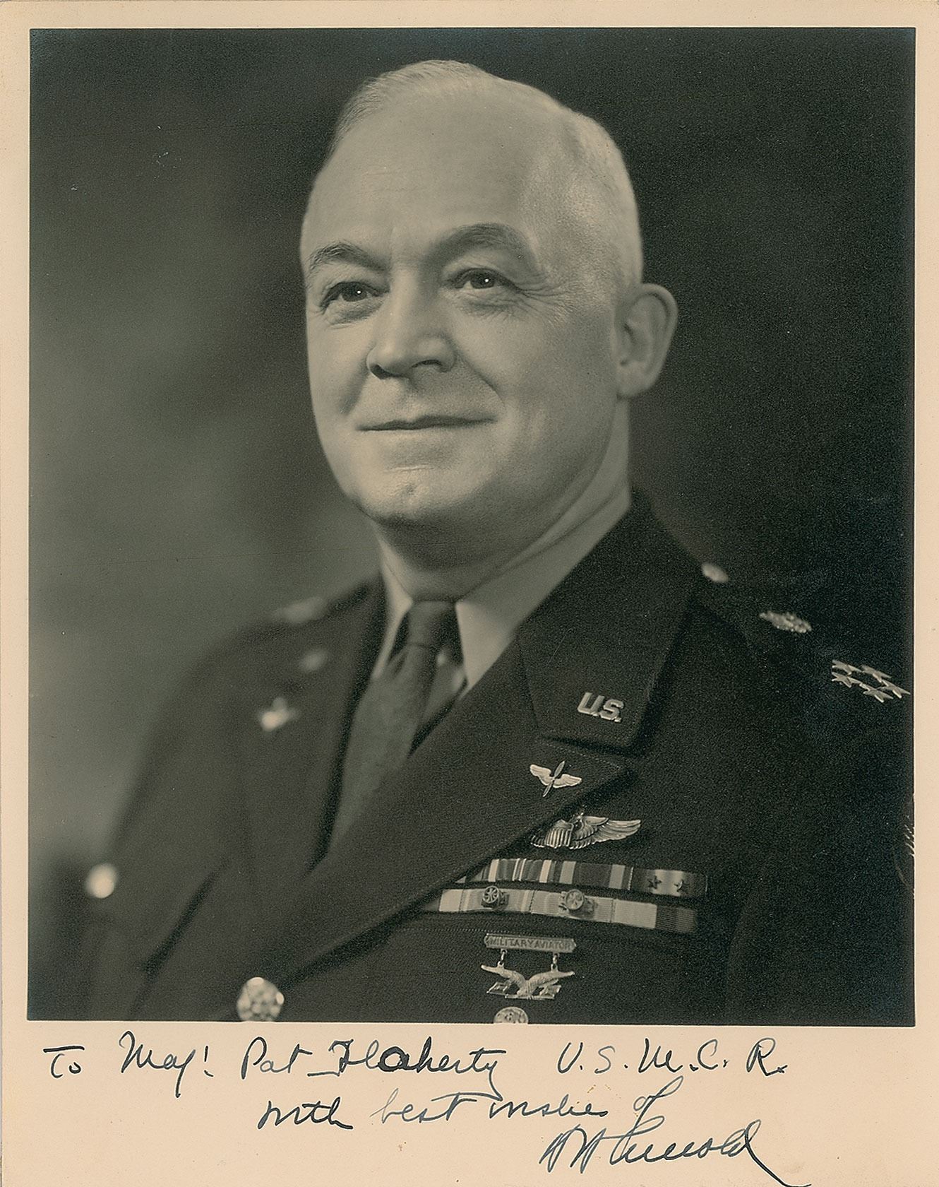 Vintage matte-finish 8 x 10 photo of Arnold in uniform, signed and inscribed in the lower border in fountain pen, "To Maj. Pat Flaherty U.S.M.C.R., with best wishes of H. H. Arnold.” In fine condition, with a Beckett label affixed to the reverse. Accompanied by a certificate of authenticity from Beckett Authentication Services.