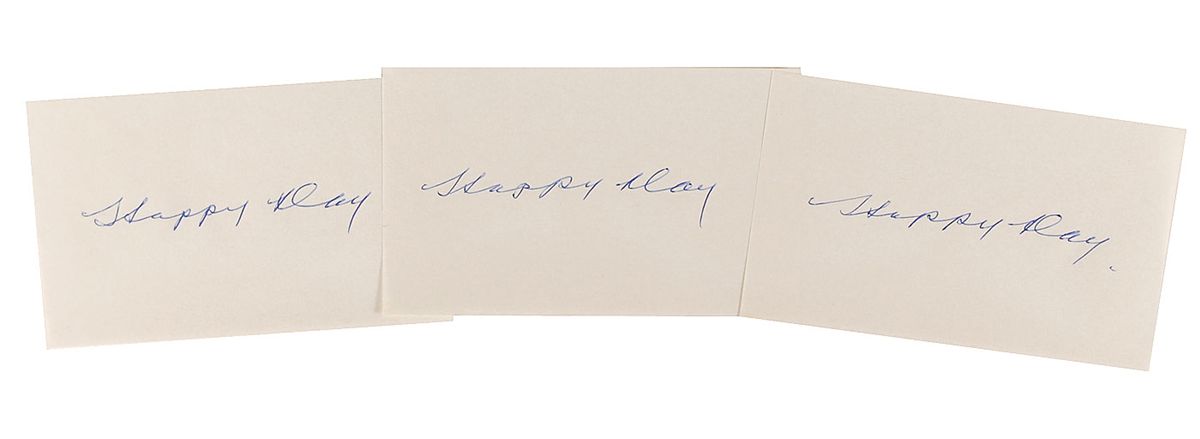 Hockey Hall of Famer (1901-1990). Three individual ballpoint signatures, “Happy Day,” on individual off-white 5 x 3 sheets. In very fine condition.