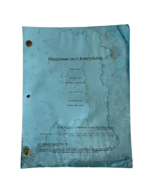 Happiness Isn't Everything -TV movie - "The Kiss" episode - written by Mitchell Hurwitz and Jim Valley, directed by James Burrows. Script is distressed and water damaged, but it is the final draft first revision from April 14, 2009, from Sony pictures TV. The cast featured: Jason Biggs, Richard Dreyfuss, Perry King, and Mary Steenburgen among others. In this episode, the storyline involves Jason's (Jason Biggs) show where a character named Gower (Luke Perry) has a girlfriend who is an alien and controls him with a "meld-kiss". Later in the episode, Jerry (Richard Dreyfuss) gives Jason a kiss on the lips in front of Moon (Michelle Krusiec).