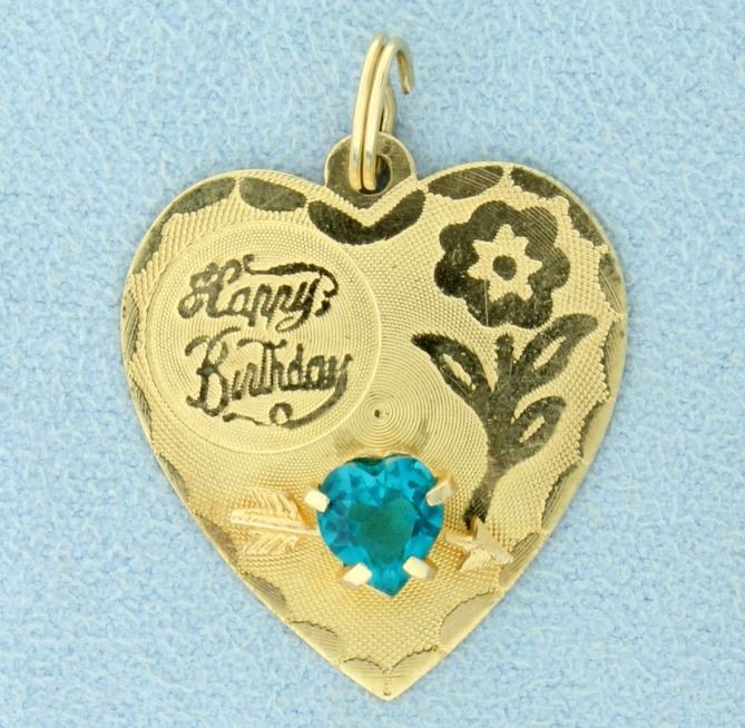In 14K yellow gold, the 6.7x6mm heart shaped synthetic aquamarine gemstone has beautiful color and clarity. It is 1 inch long. 2.9g