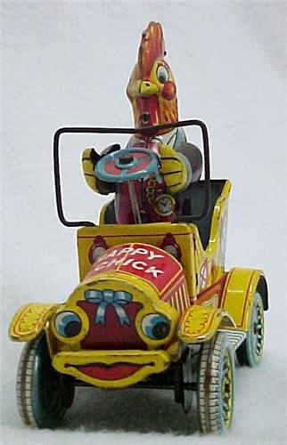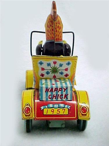 Happy Chick; tin toy; E.T.C.P Made in Japan; 5" across; some paint wear on sides on driver and edges of car; small dent on side tire.