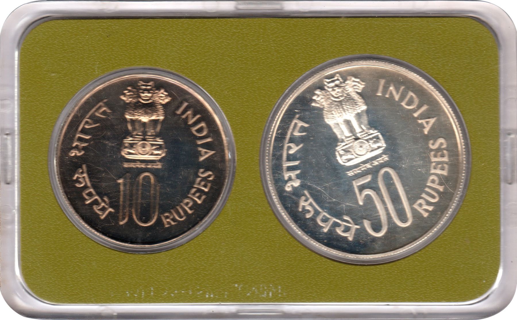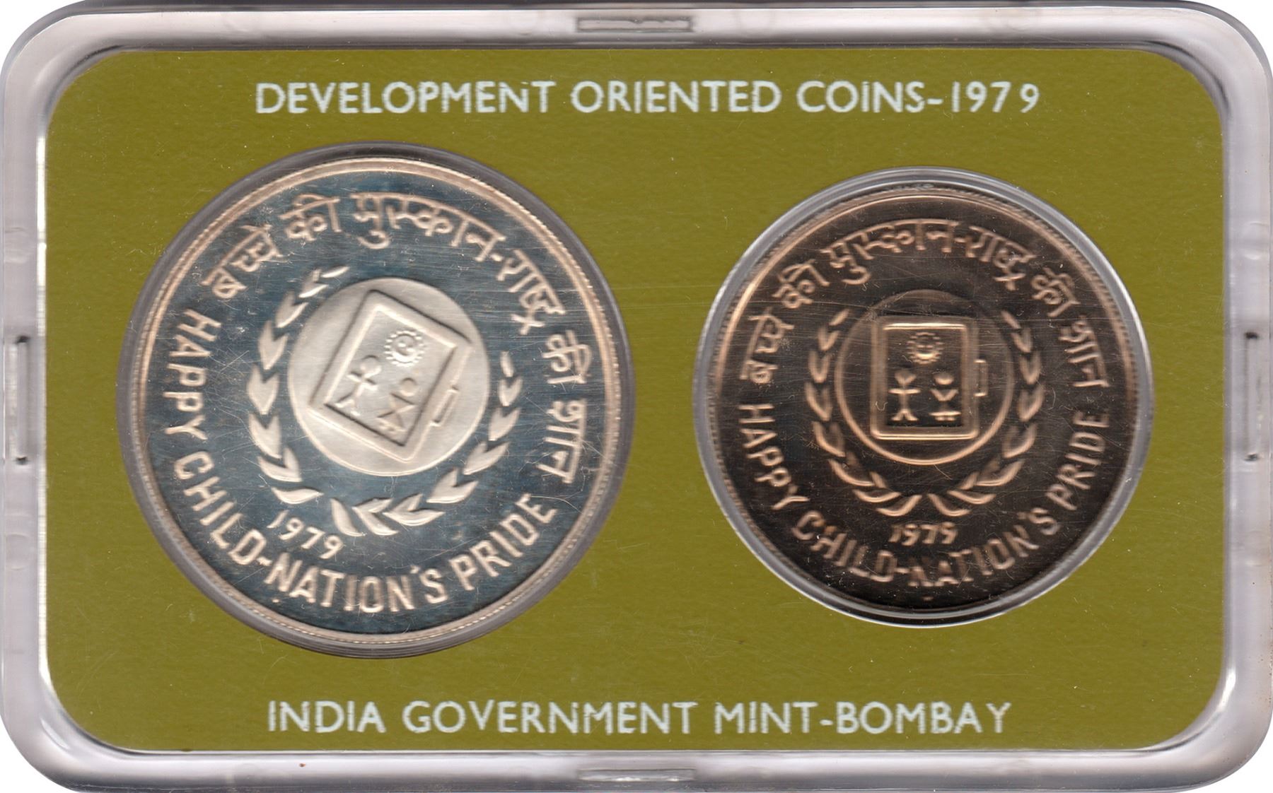 Republic India, 1979, UNC Set, Happy Child Nation’s Pride, Set of 2 Coins, Silver 50 Rupees & Copper-Nickel 10 Rupees, Bombay Mint, (KM # MS 22/RB # 74), intact in an acrylic case with outer cover and certificate, outer cover slightly torned, UNC.