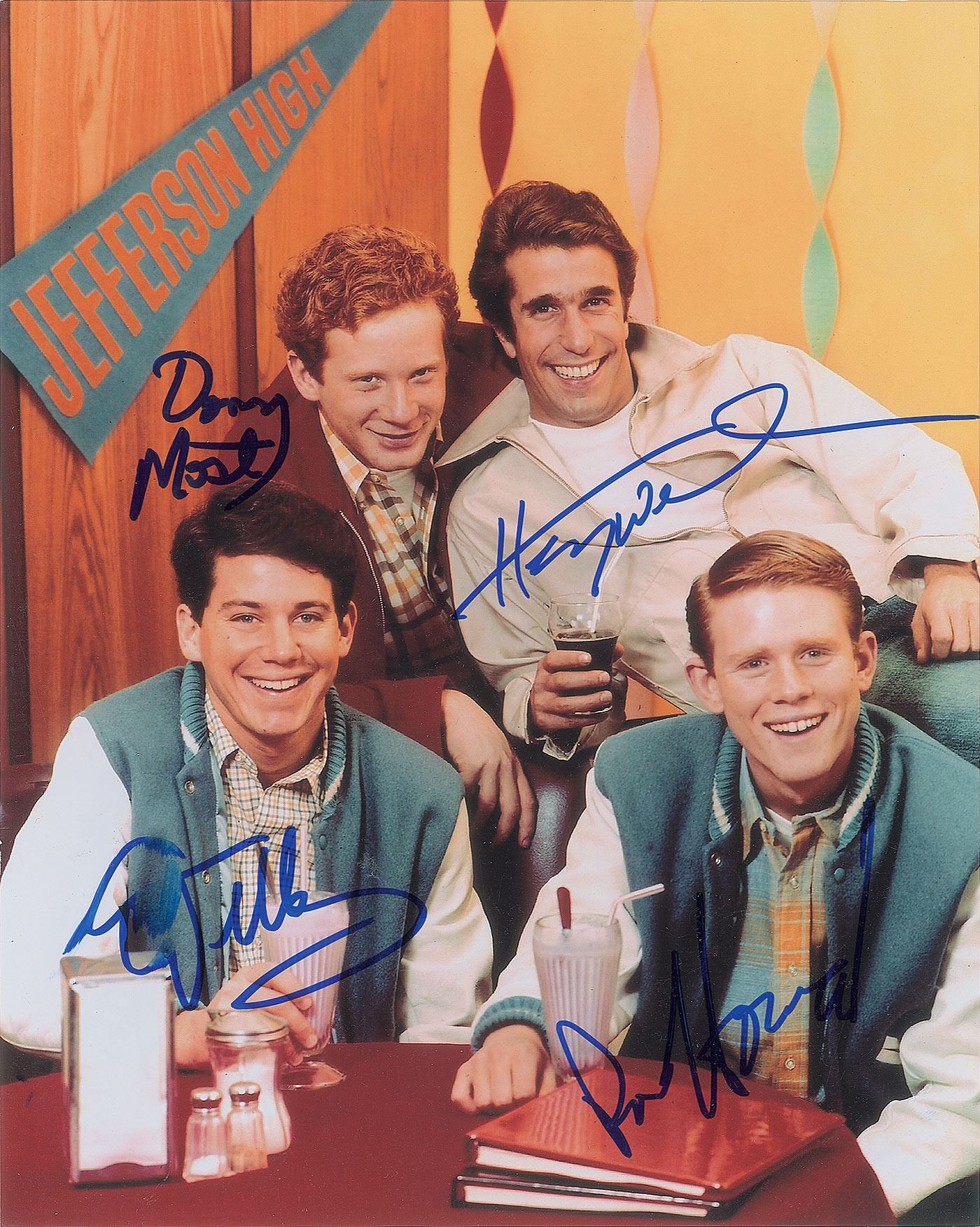 Color glossy 8 x 10 photo of the four stars from the show Happy Days, signed in blue felt tip by Henry Winkler, Donny Most, Anson Williams, and Ron Howard. In fine condition, with some brushing to the Williams signature. Originally obtained by in-person specialist Mike Wehrmann.