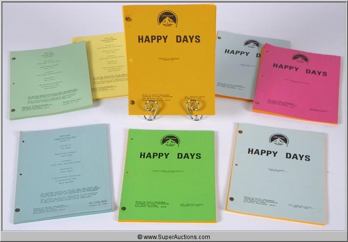 "Happy Days" Scripts / Paramount Pictures Corporation ~ "Fonzie's A Thespian" / #60537-153 / Revised Shooting Script / October 12, 1979 ~ "Joanie Busts Out" / #60537-156 / Revised Shooing Script / November 2, 1979 ~ "Here Comes The Bride-Again" / #60537-157 / Revised Shooing Script / November 9, 1979 ~ "Fonzie Versus The She-Devils" / #60537-158 / Revised Shooing Script / November 16, 1979 ~ "Live and Learn" / #60538-168 / Revised Shooing Script / July 18, 1980 ~ "Joanie Gets Wheels" / #60538-169 / Shooting Script / October 16, 1980 ~ "No Tell Motel" / #60538-170 / Revised Final Draft / October 22, 1980 ~ "Dreams can Come True" / #60538-171 / Revised Final Draft / October 28, 1980 ~ "The Sixth Sense" / #60538-177 / Shooting Script / December 18, 1980 ~ "It Only Hurts When I Smile" / #60538-178 / Shooting Script / January 8, 1981