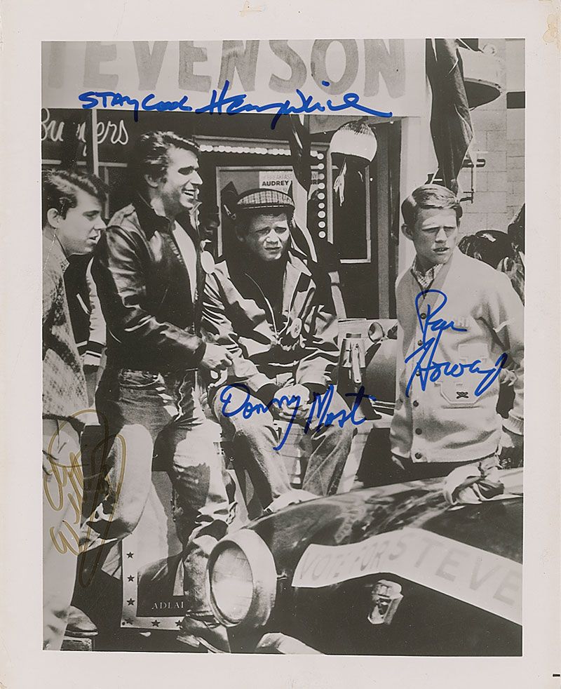 Glossy 8 x 10 photo of The Fonz and friends hanging out in front of Arnolds, signed in blue felt tip by Henry Winkler, Ron Howard, and Donnie Most, and in brown felt tip by Anson Williams. A diagonal crease to top left, a bit of light soiling, and Williams’s signature faded, but still legible, otherwise fine condition.