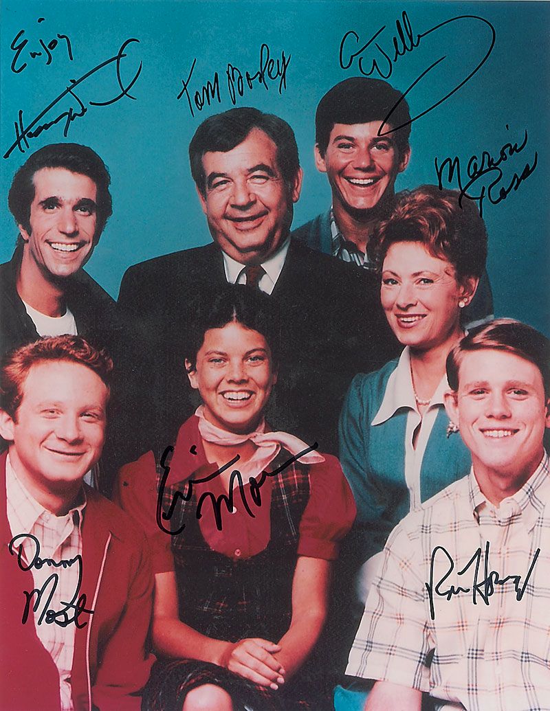 Color glossy 10 x 13 photo of the Happy Days cast, signed in black felt tip by Henry Winkler, Donny Most, Erin Moran, Tom Bosley, Anson Williams, Marion Ross, and Ron Howard. In fine condition.
