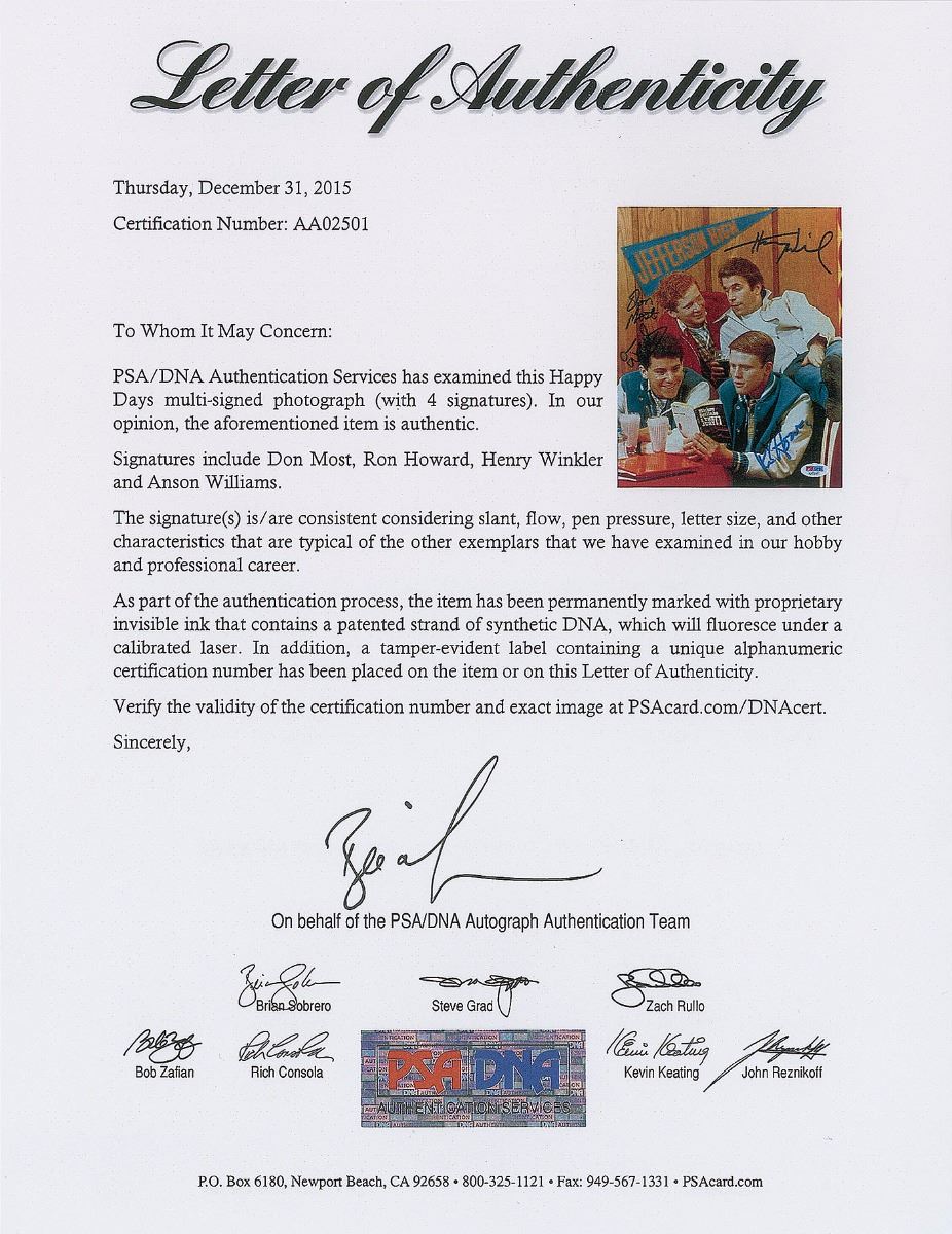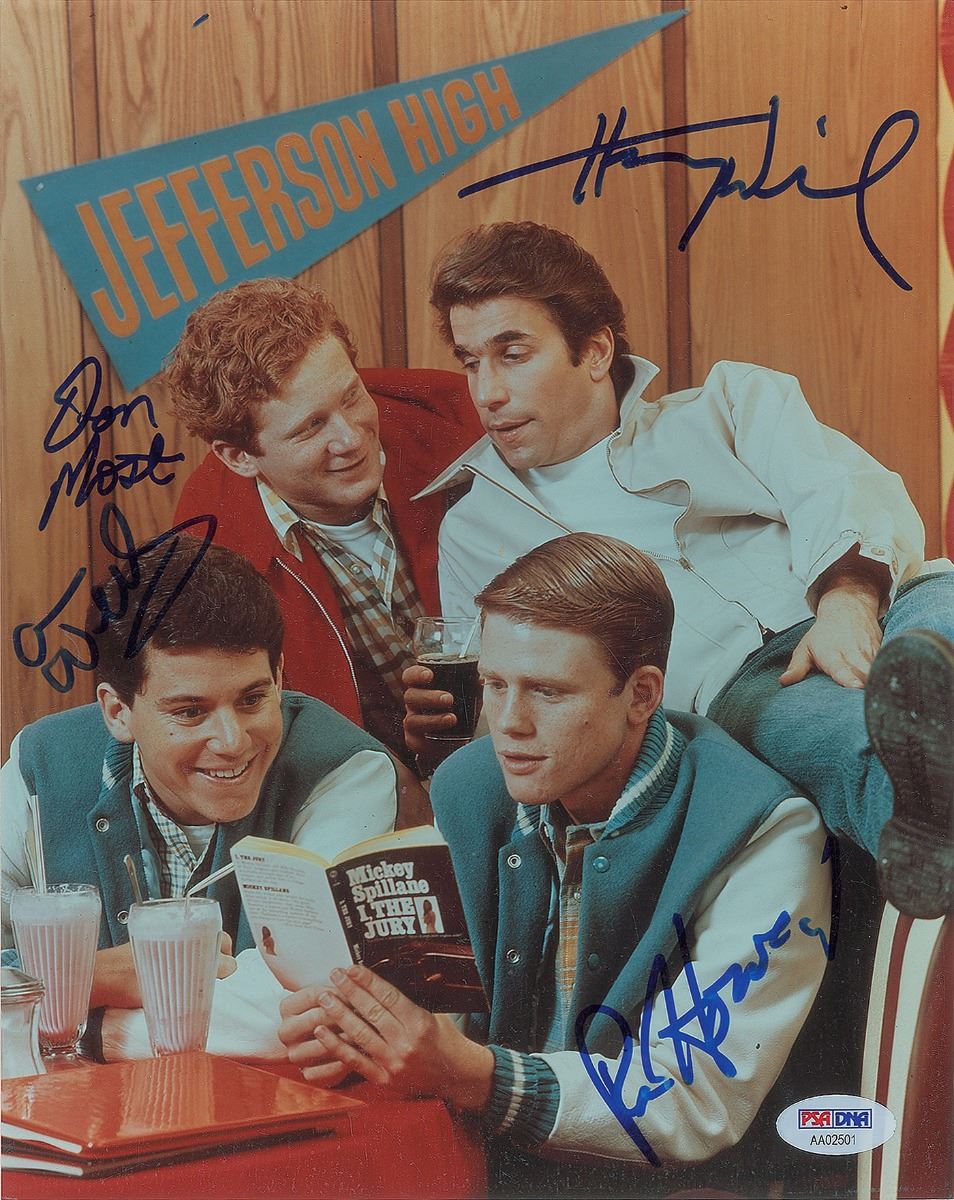 Color glossy 8 x 10 photo of the Fonz and friends reading a Mickey Spillane novel, signed in blue and black felt tip by Henry Winkler, Ron Howard, Donny Most, and Anson Williams. In fine condition. Accompanied by a full letter of authenticity from PSA/DNA.