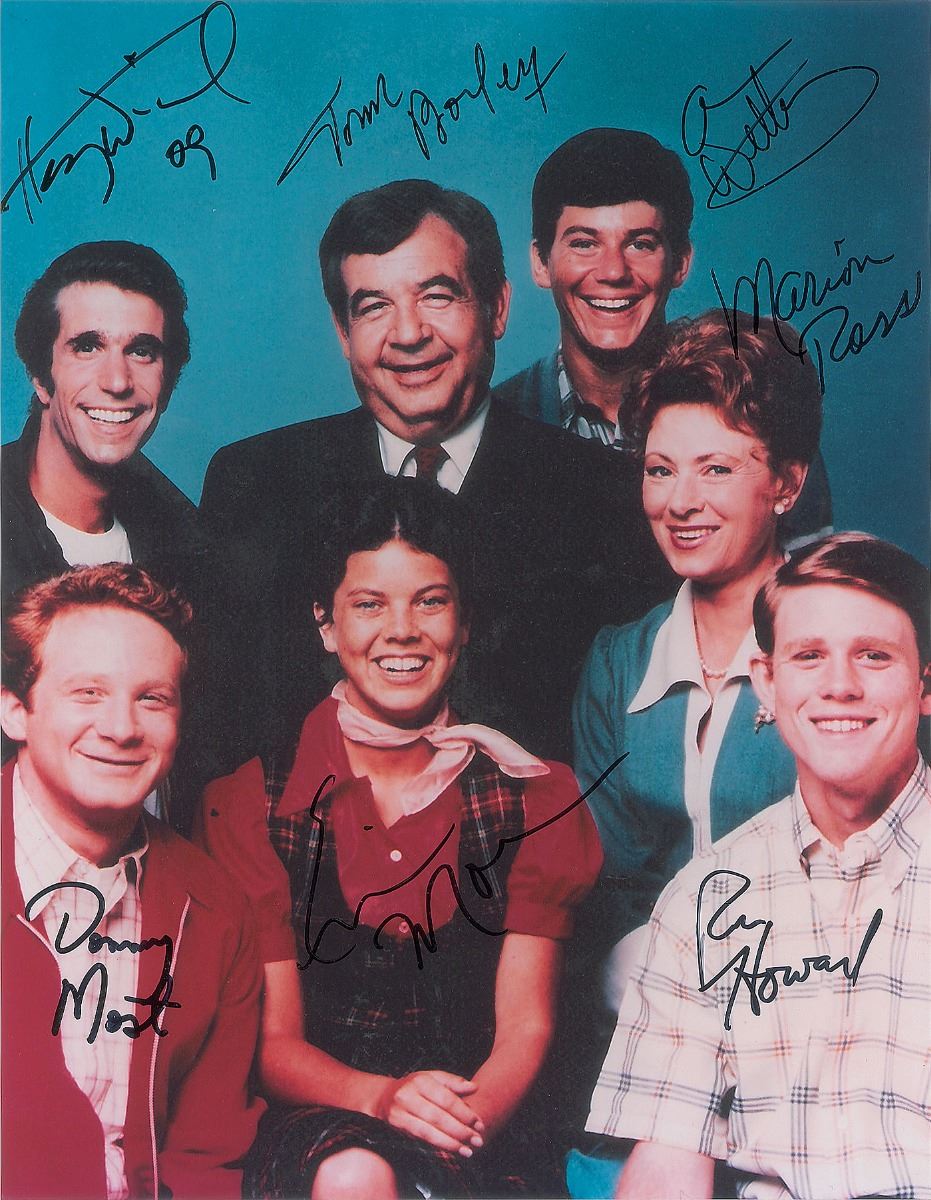 Color glossy 10 x 12.75 photo of the cast of Happy Days, signed in black felt tip by Henry Winkler, Donny Most, Erin Moran, Tom Bosley, Anson Williams, Marion Ross, and Ron Howard. In fine condition. Accompanied by a photo taken at the time of the Howard signing.