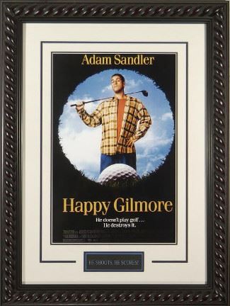 Happy Gilmore is a 1996 sports comedy film directed by Dennis Dugan and produced by Robert Simonds. It stars Adam Sandler as the title character, an unsuccessful ice hockey player who discovers a talent for golf. The screenplay was written by Sandler and Tim Herlihy. This film was the first of multiple collaborations between Sandler and Dugan.This is an Unsigned Publicity Masterprint 11x17 inch movie poster with museum Quality Custom Rope Framed as shown to an overall size of 20x28. The perfect addition to complement any Home Theater Collection.