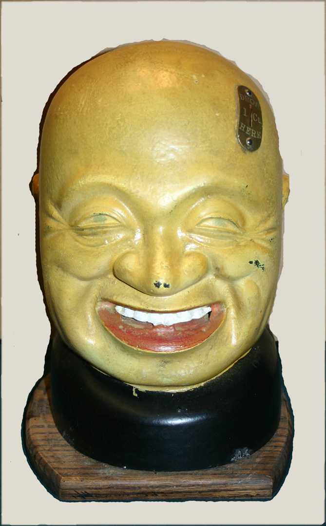 Happy Jap Peanut Dispenser (Smiling Sam). Tag on back reads White Vending Co. 1902. Cast iron front with back apparently zinc. Original works with old repairs. Wooden base may be a replacement. Good color. No breaks.