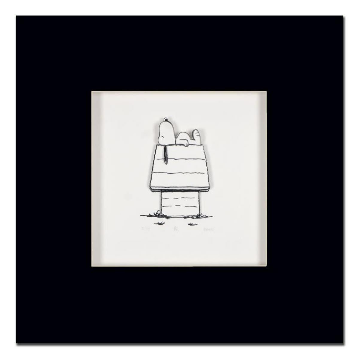 Happy Place by Peanuts. Created from the original artwork archived at the studio, "Happy Place" portrays the simple yet emotive art of Charles. M. Schulz, creator of PEANUTS. This 3D decoupage print on paper is hand numbered with Certificate of Authenticity. Measures approx. 15.5" x 15.5" (shadow box), 5" x 5" (image).